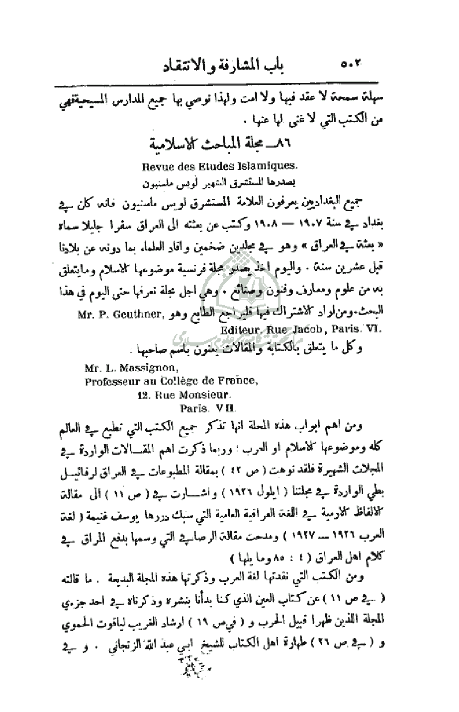ومن أهم أبواب هذه المجلة أنها تذكر جميع الكتب التي تطبع في العالم كله وموضوعها الإسلام أو العرب؛ وربما ذكرت أهم المقالات الواردة في المجلات الشهيرة فلقد نوهت (ص42) بمقالة المطبوعات في العراق لرفائيل بطي الواردة في مجلتنا (أيلول 1926) وأشارت في (ص11) إلى مقالة الألفاظ الارمية في اللغة العراقية العامية التي سبك دررها يوسف غنيمة (لغة العرب 1926 - 1927) ومدحت مقالة الرصافي التي وسمها بدفع المراق، في كلام أهل العراق (4: 85 وما يلها)