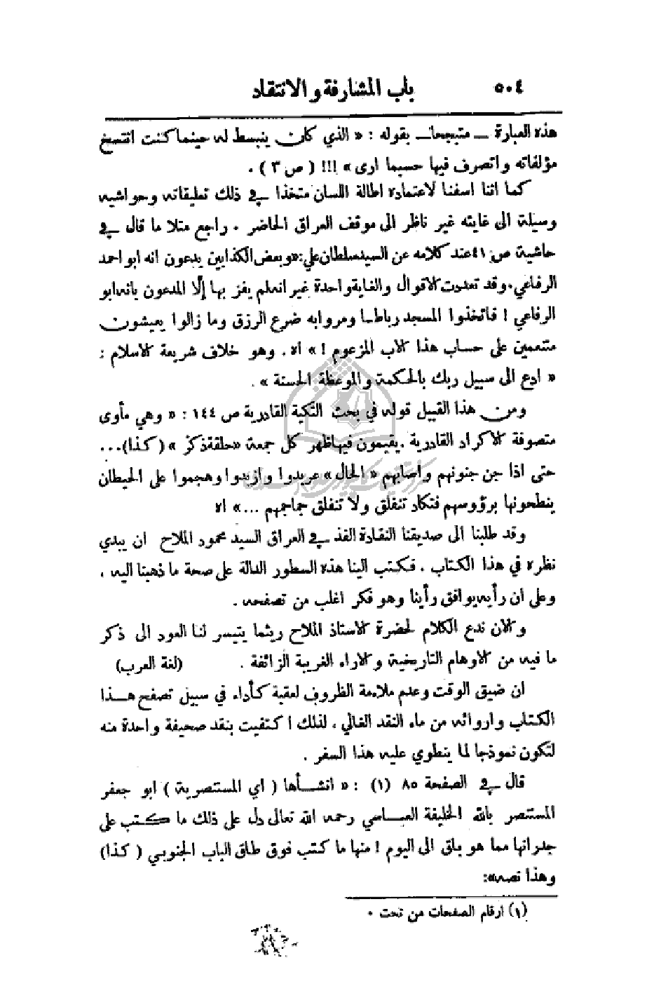 كما إننا أسفنا لاعتماده إطالة اللسان متخذا في ذلك تعليقاته وحواشيه وسيلة إلى غايته غير ناظر إلى موقف العراق الحاضر. راجع متلا ما قال في حاشية ص41 عند كلامه عن السيد سلطان علي: (وبعض الكذابين يدعون انه أبو احمد الرفاعي. وقد تعددت الأقوال والغاية واحدة غير انه لم يفز بها إلا المدعون بأنه أبو الرفاعي! فاتخذوا المسجد رباطا ومروابه ضرع الرزق وما زالوا يعيشون متنعمين على حساب هذا الأب المزعوم!) اهـ. وهو خلاف شريعة الإسلام: (ادع إلى سبيل ربك بالحكمة والموعظة الحسنة).