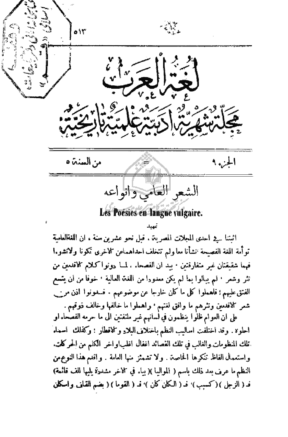 أثبتنا في إحدى المجلات المصرية، قبل نحو عشرين سنة، أن اللغة العالمية العامية توأمة اللغة الفصيحة. نشأتا معاً ولم تتخلف إحداهما عن الأخرى نكونا ولا نشوءاً فهما شقيقتان غير متفارقتين. بيد أن الفصحاء، لما دونوا كلام الأقدمين من نثر وشعر، لم يبالوا بما لم يكن معدودا من اللغة العالمية. خوفاً من أن يتسع الفتق عليهم: فأهملوا كل ما كان خارجاً عن موضوعهم. فدونوا أذن من شعر الأقدمين ونثرهم ما وافق لغتهم، وأهملوا ما خالفها وخالف ذوقهم.