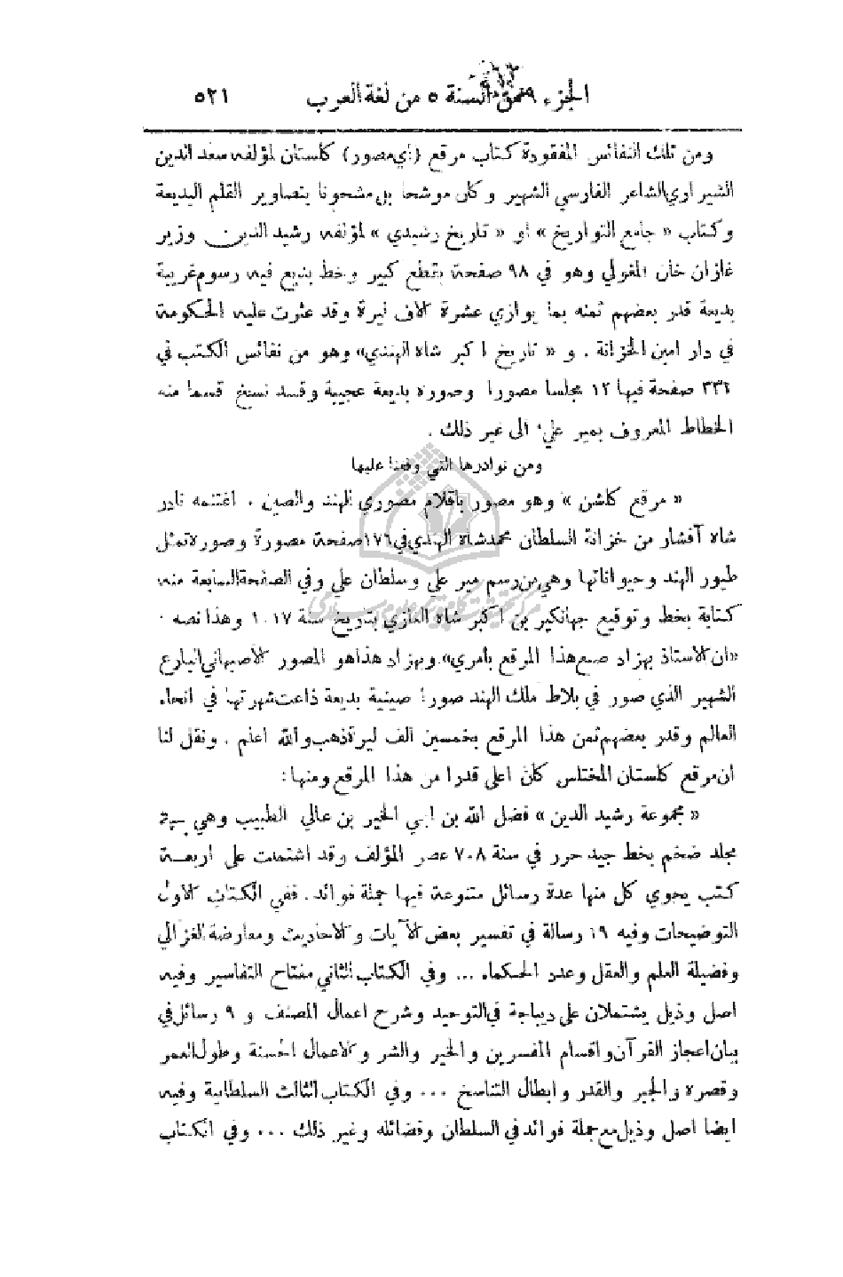 ومن تلك النفائس المفقودة كتاب مرقع (أي مصور) كلستان لمؤلفه سعد الدين الشيرازي الشاعر الفارسي السهير وكان موشحا بل موشحونا بتصوير القلم البديعة وكتاب (جامع التواريخ) أو (تاريخ رشيدي) لمؤلفه رشيد الدين وزير غازان خان المغولي وهو في 98 صفحة بقطع كبير وخط بديع فيه رسوم غريبة بديعة قدر بعضهم ثمنه بما يوازي عشرة آلاف ليرة وقد عثرت عليه الحكومة في دار أمين الخزانة. و (تاريخ أكبر شاه الهندي) وهو من نفائس الكتب في 332 صفحة فيها 12 مجلسا مصورا وصورة عجيبة وقد نسخ قسما منه الخطاط المعروف بمير علي، إلى غير ذلك.