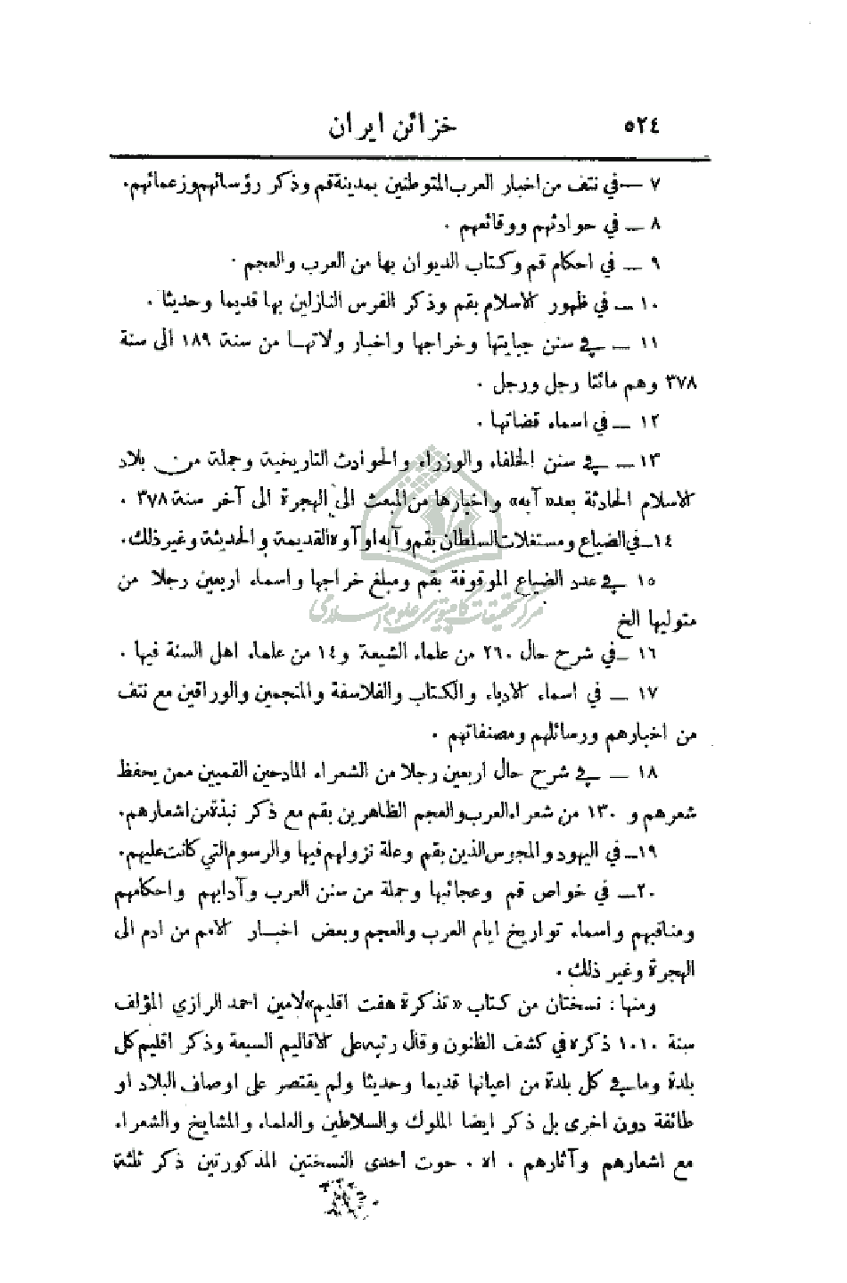 20 - في خواص قم وعجائبها وجملة من سنن العرب وآدابهم وأحكامهم ومناقبهم وأسماء تواريخ أيام العرب والعجم وبعض أخبار تلائم من آدم إلى الهجرة وغير ذلك.