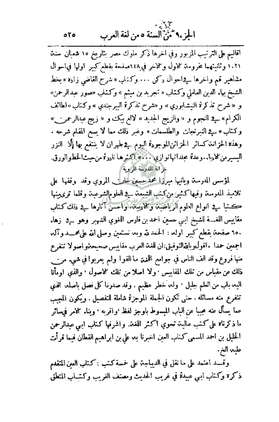 صحيحة واصولاً تتفرع منها فروع وقد ألف الناس في جوامع اللغة ما ألفوا ولم يعربوا في شيء من ذلك عن مقاييس من تلك المقاييس، ولا أصلا من تلك الأصول، والذي أومأنا إليه باب من العلم جليل، وله خطر عظيم، وقد صدرنا كل فصل بأصلة الذي تتفرع منه مسائله، حتى تكون الجملة الموجزة شاملة للتفصيل. ويكون المجيب ما ذكرناه على كتب عالية تحوي اكثر اللغة. وأشرفها كتاب أبي عبد الرحمن الخليل بن احمد المسمى كتاب العين اخبرنا به علي بن إبراهيم القطان فيما قرأت عليه الخ.