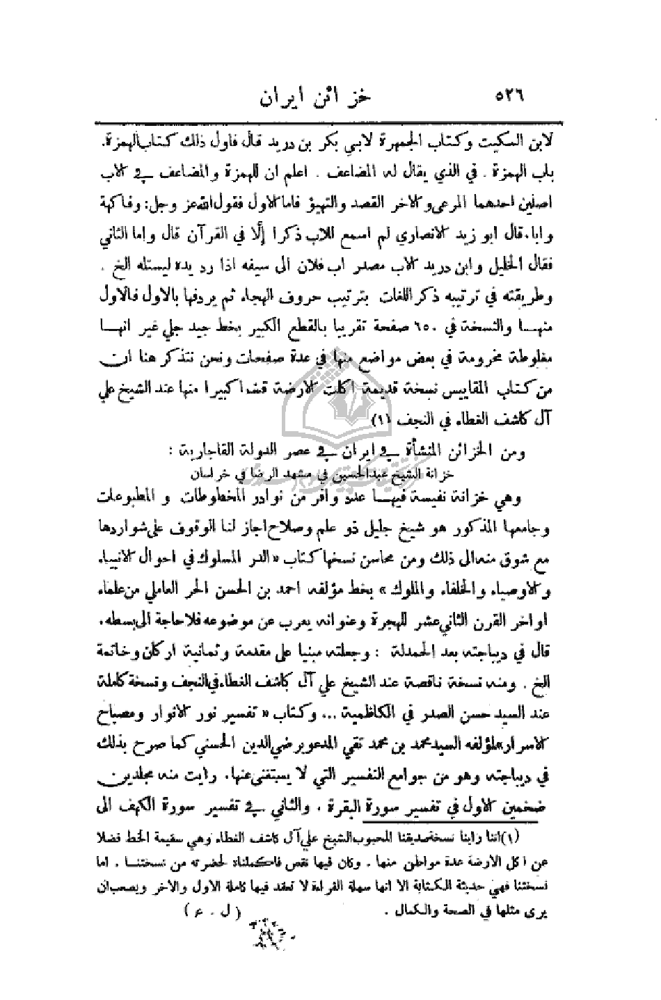 مقدمة وثمانية أركان وخاتمة الخ. ومنه نسخة ناقصة عند الشيخ علي آل كاشف الغطاء في النجف ونسخة كاملة عند السيد حسن الصدر في الكاظمية. . . وكتاب (تفسير نور الأنوار ومصباح الأسرار) لمؤلفه السيد محمد بن محمد تقي المدعو برضي الدين الحسني كما صرح بذلك في ديباجة وهو من جوامع التفسير التي لا يستغني عنها. رأيت منه مجلدين ضخمين الأول في تفسير سورة البقرة. والثاني في تفسير سورة الكهف إلى
