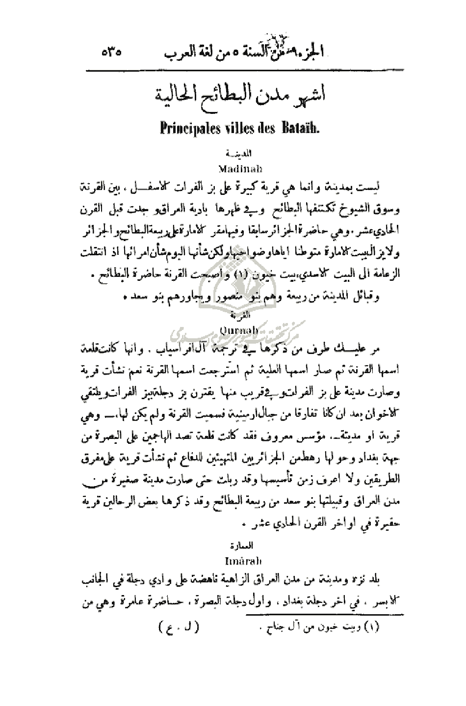 مر عليك طرف من ذكرها في ترجمة آل فراسياب. وإنها قلعة اسمها القرنة ثم صار اسمها العلية ثم استرجعت اسمها القرنة نعم نشأت قرية وصارت مدينة على بز الفرات وفي قريب منها يقترن بز دجلة ببز الفرات ويلتقي الأخوان بعد أن كانا تفارقا من جبال أرمينية فسميت القرنة ولم يكن لها، - وهي قرية أو مدينة -، مؤسس معروف فقد كانت قلعة تصد الهاجمين على البصرة من جهة بغداد وحولها رهط من الجزائريين المتهيئين للدفاع ثم نشأت قرية على مفرق الطريقين ولا اعرف زمن تأسيسها وقد ربلت حتى صارت مدينة صغيرة من مدن العراق وقبيلتها بنو سعد من ربيعة البطائح وقد ذكرها بعض الرحالين قرية حقيرة في أواخر القرن الحادي عشر.