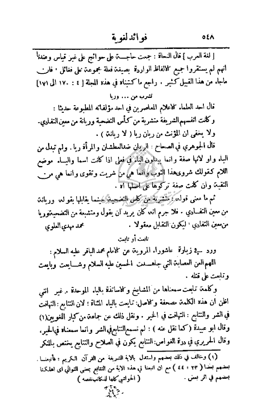 وكلمة تابعت سمعناها من المشايخ والأساتذة بالباء الموحدة. غير أنني أظن أن هذه الكلمة مصحفة والأصل: تابعت بالياء المثناة؛ لأن التتابع: التهافت في الشر والتتابع: التهافت في الخير. ونقل ذلك عن جماعة من كبار اللغويين وقال أبو عبيدة (كما نقل عنه): لم نسمع التتابع في الشر وإنما سمعناه في الخير، وقال الحريري في درة الغواص: التتابع يكون في الصلاح والتتابع يختص بالمنكر
