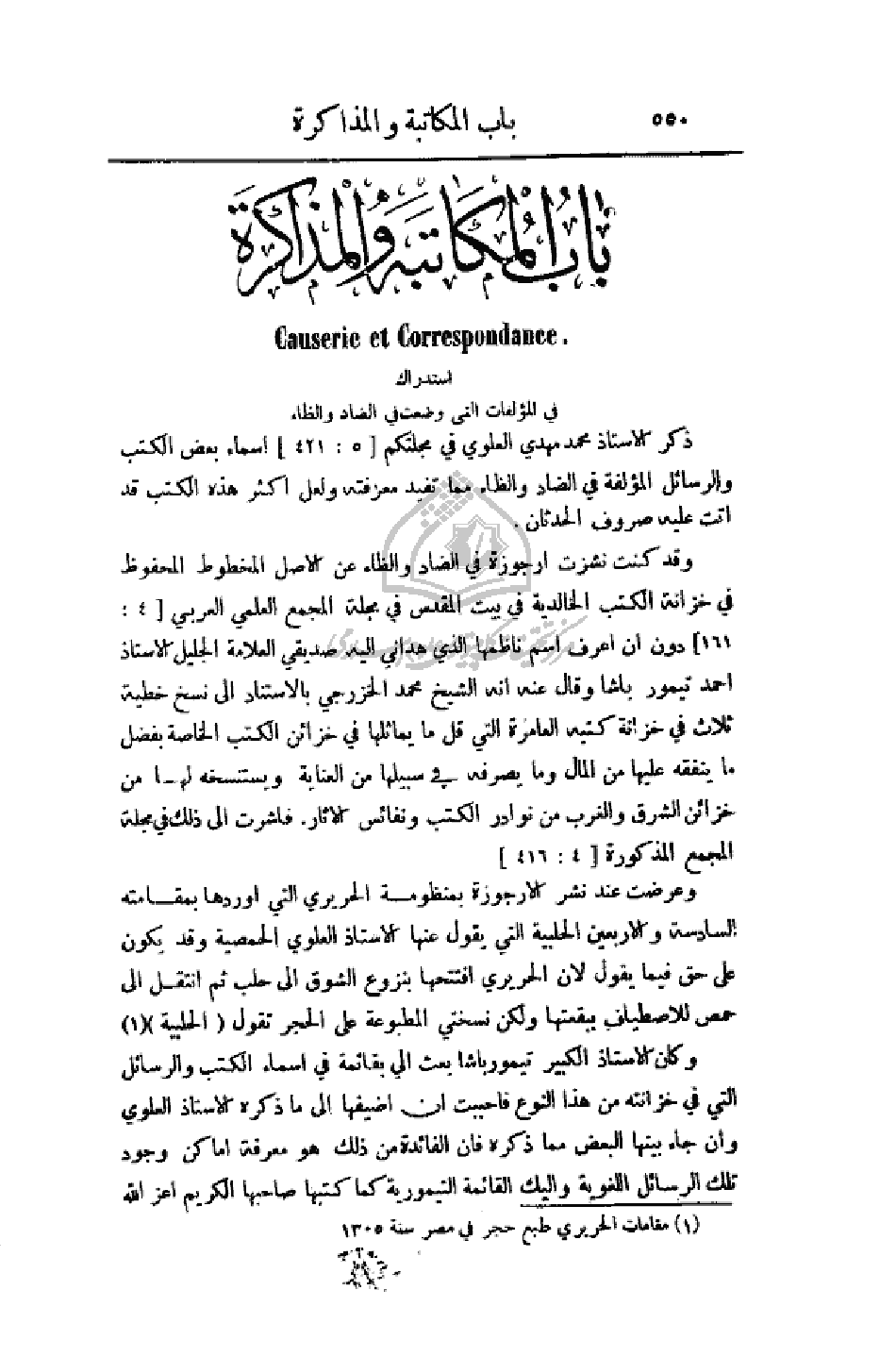 وكان الأستاذ الكبير تيمور باشا بعث ألي بقائمة في أسماء الكتب والرسائل التي في خزانته من هذا النوع فأحببت أن أضيفها إلى ما ذكره الأستاذ العلوي وان جاء بينها البعض مما ذكره فان الفائدة من ذلك هو معرفة أماكن وجود تلك الرسائل اللغوية واليك القائمة التيمورية كما كتبها صاحبها الكريم اعز الله