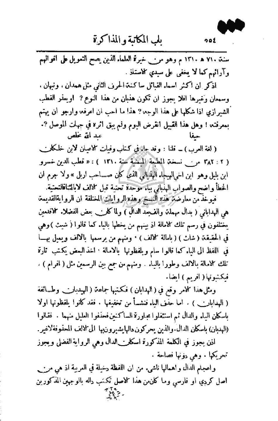 اذكر أن اكثر أسماء القبائل ساكنة الحرف الثاني مثل همدان، ونبهان، وسمعان وغيرها أفلا يجوز أن تكون هذبان من هذا النوع؟ أو يعذر القطب الشيرازي إذا شكلها على هذا الوجه؟ هذا ما احب أن اعرفه وأرجو أن يهتم بمعرفته! وهل هذا القبيل انقرض اليوم ولم يبقى أثره في جهات الموصل؟.