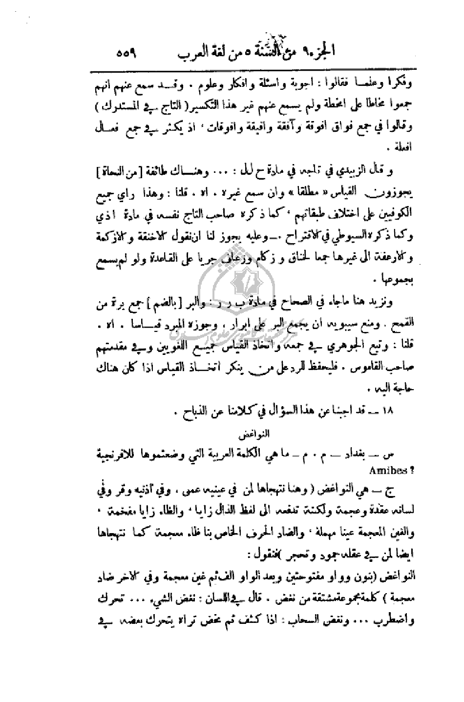 وقال الزبيدي في تاجه في مادة ح ل ل. . . . وهناك طائفة (من النحاة) يجوزون القياس (مطلقا) وان سمع غيره. اهـ. قلنا: وهذا رأي جميع الكوفيين على اختلاف طبقاتهم، كما ذكره صاحب التاج نفسه في مادة أذى وكما ذكره السيوطي في الاقتراح. - وعليه يجوز لنا أن نقول الاخنقة والازكمة والارعفة إلى غيرها جمعا لخناق وزكام ورعاف جريا على القاعدة ولو لم يسمع بجموعها.