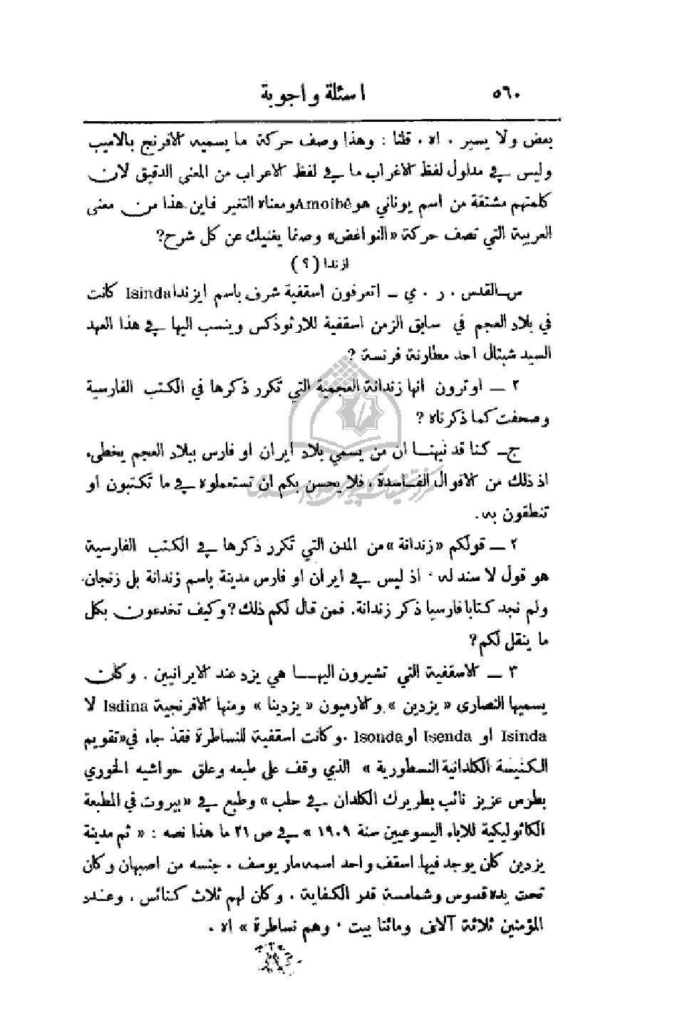 2 - أو ترون إنها زندانة العجمية التي تكرر ذكرها في الكتب الفارسية وصحفت كما ذكرناه؟ ج - كنا قد نبهنا أن من يسمي بلاد إيران أو فارس ببلاد العجم يخطئ إذ ذلك من الأقوال الفاسدة، فلا يحسن بكم أن تستعملوه في ما تكتبون أو تنطقون به.
