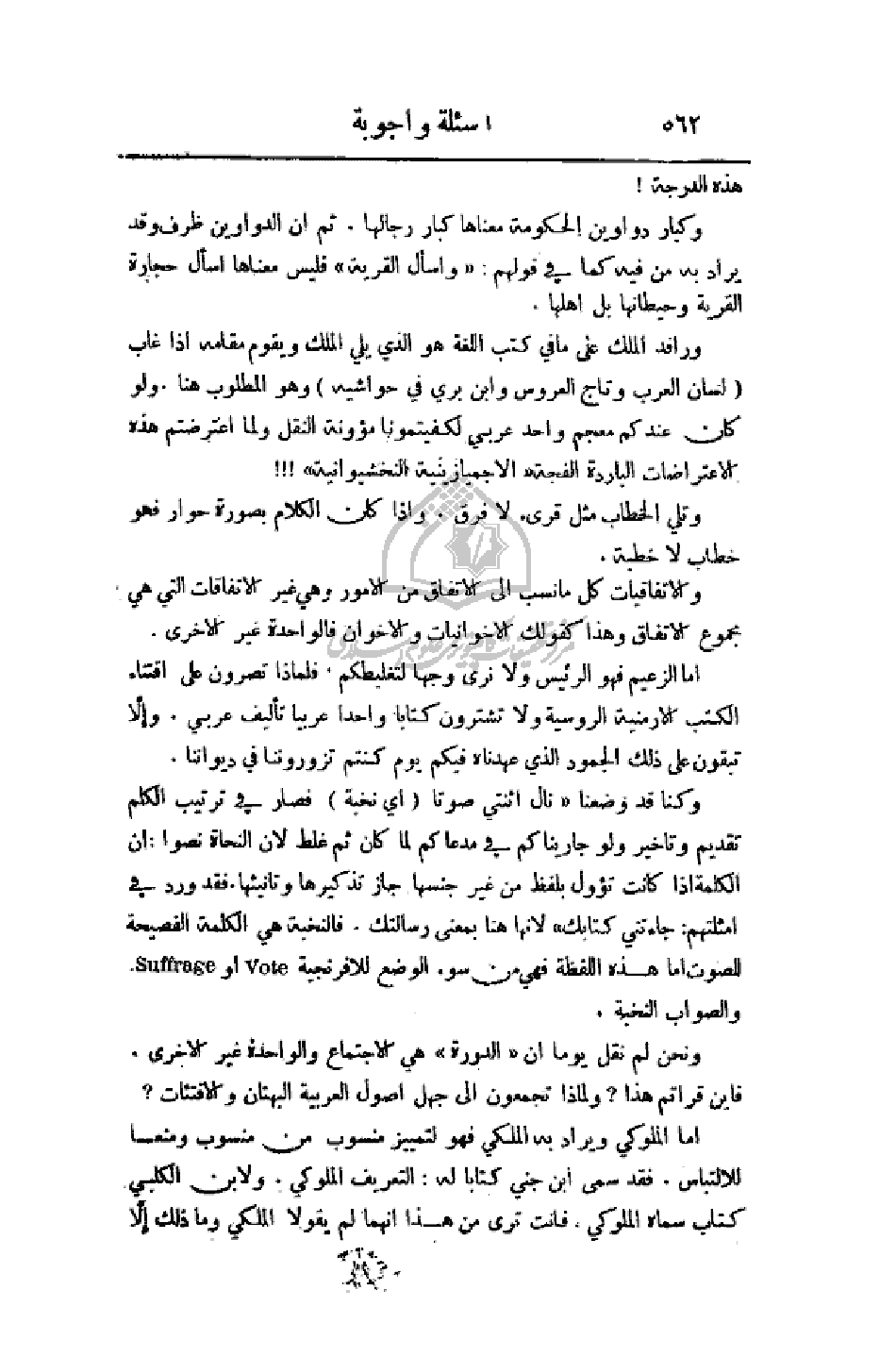 وكنا قد وضعنا (نال اثنتي صوتا (أي نخبة) فصار في ترتيب الكلم تقديم وتأخير ولو جاريناكم في مدعاكم لما كان ثم غلط لان النحاة نصوا: أن الكلمة إذا كانت تؤول بلفظ من غير جنسها جاز تذكيرها وتأنيثها. فقد ورد في أمثلتهم: جاءتني كتابك) لأنها هنا بمعنى رسالتك. فالنخبة هي الكلمة الفصيحة للصوت أما هذه اللفظة فهي من سوء الوضع للإفرنجية أو والصواب النخبة.