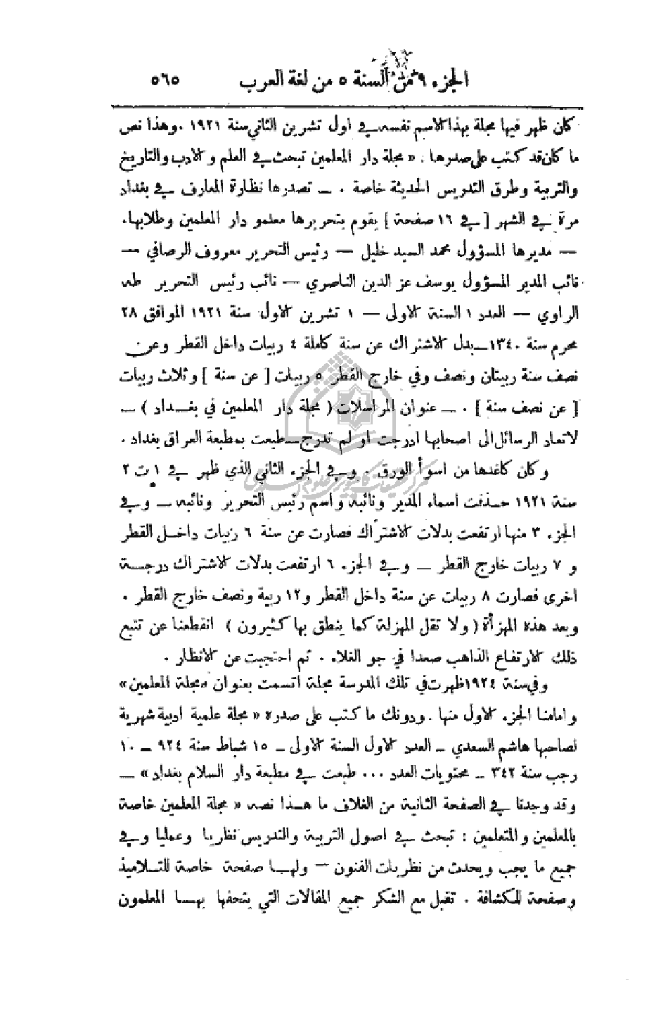 المسؤول محمد السيد خليل - رئيس التحرير معروف الرصافي - نائب المدير المسؤول يوسف عز الدين الناصري - نائب رئيس التحرير طه الراوي - العدد 1 السنة الأولى - 1 تشرين الأول سنة 1921 الموافق 28 محرم سنة 1340 - بدل الاشتراك عن سنة كاملة 4 ربيات داخل القطر ومن نصف السنة ربيتان ونصف وفي خارج القطر 5 ربيات (عن سنة) وثلاث ربيات (عن نصف سنة). - عنوان المراسلات (مجلة دار المعلمين في بغداد) - لا تعاد الرسائل أصحابها أدرجت أو لم تدرج - طبعت بمطبعة العراق بغداد.