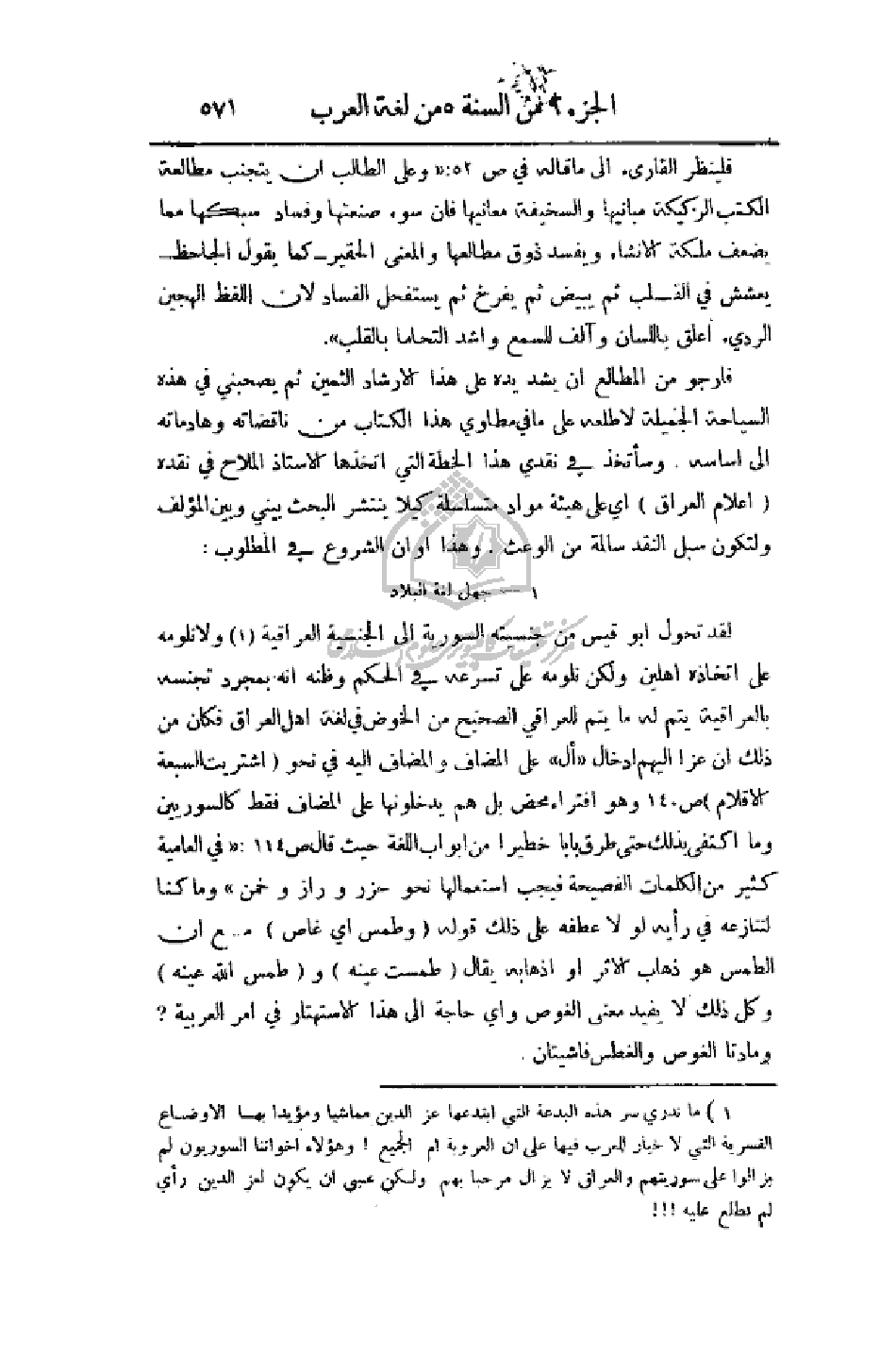 لقد تحول أبو قيس من جنسيته السورية إلى الجنسية العراقية ولا نلومه على اتخاذه آهلين ولكن نلومه على تسرعه في الحكم وظنه انه بمجرد تجنسه بالعراقية يتم له للعراقي الصحيح من الخوض في لغة أهل العراق فكان من ذلك أن عزا إليهم إدخال (أل) على المضاف والمضاف إليه في نحو (اشتريت السبعة الأقلام) ص 140 وهو افتراء محض بل هم يدخلونها على المضاف فقط كالسوريين وما اكتفى بذلك حتى طرق بابا خطيرا من أبواب اللغة حيث قال ص144: (في العامية كثير من الكلمات الفصيحة فيجب استعمالها نحو حزر وزار وخمن) وما كنا لننازعه في رأيه لولا عطفه على ذلك قوله (وطمس أي غاص) مع أن الطمس هو ذهاب الأثر أو إذهابه يقال (طمست عينه) و (طمس عينه) وكل ذلك لا يفيد معنى الغوص وأي حاجة إلى هذا الاستهتار في أمر العربية؟ ومادتا الغوص