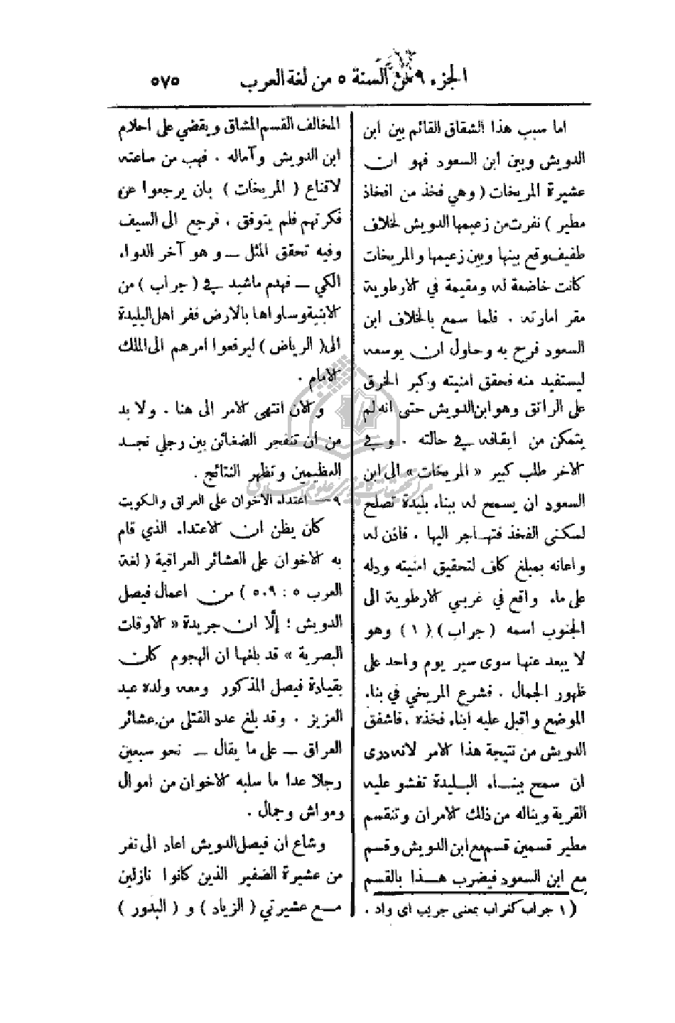 كان يظن أن الاعتداء الذي قام به الأخوان على العشائر العراقية (لغة العرب 5: 509) من أعمال فيصل الدويش؛ إلا أن جريدة (الأوقات البصرية) قد بلغها أن الهجوم كان بقيادة فيصل المذكور ومعه ولده عبد العزيز. وقد بلغ عدد القتلى من عشائر العراق - على ما يقال - نحو سبعين رجلا عدا ما سلبه الأخوان من أموال ومواش وجمال.