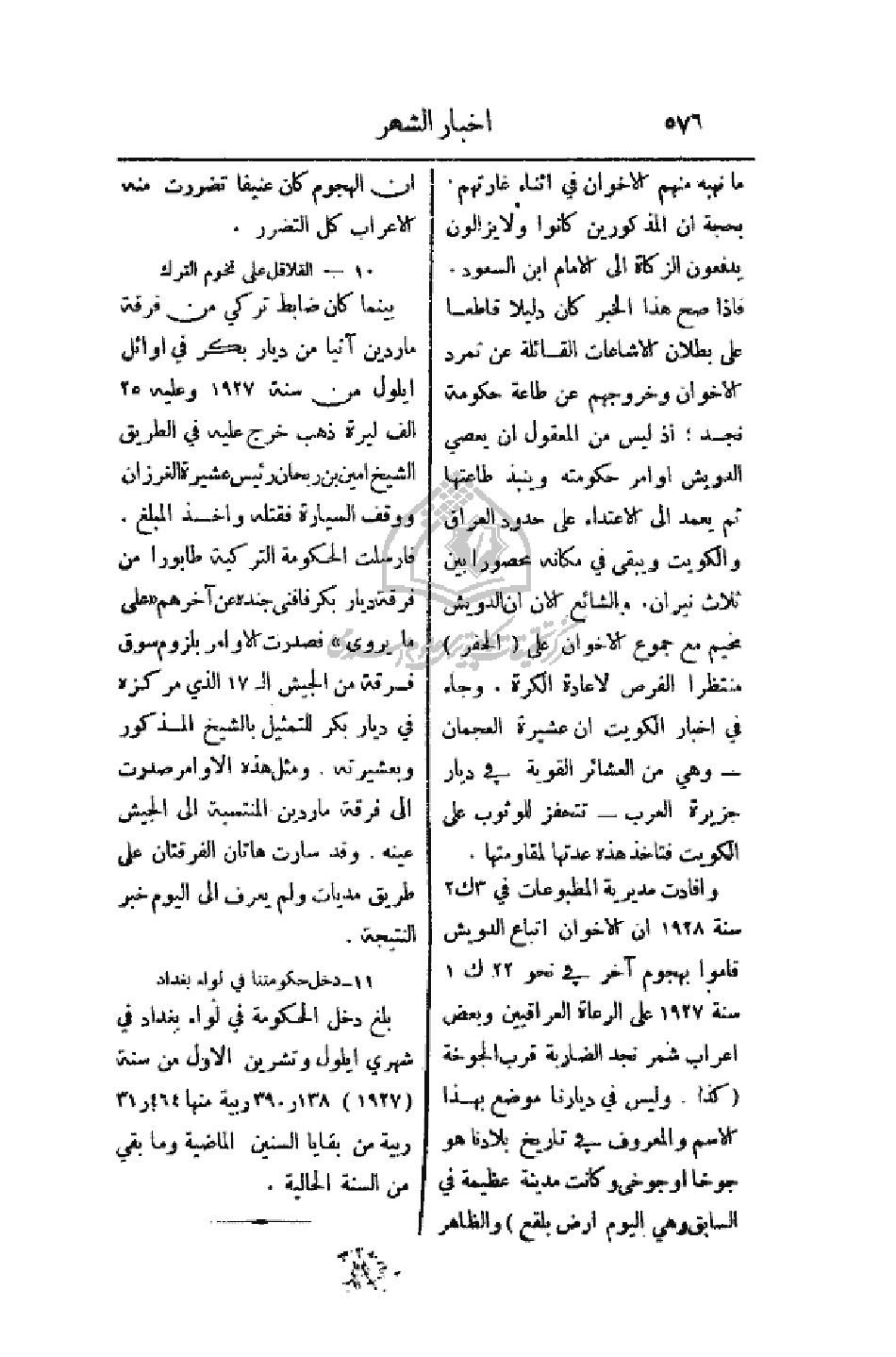 ما نهبه منهم الإخوان في أثناء غاراتهم، بحجة أن المذكورين كانوا ولا يزالون يدفعون الزكاة إلى الإمام ابن السعود. فإذا صح هذا الخبر كان دليلا قاطعا على بطلان الإشاعات القائلة عن تمرد الأخوان وخروجهم عن طاعة حكومة نجد؛ إذ ليس من