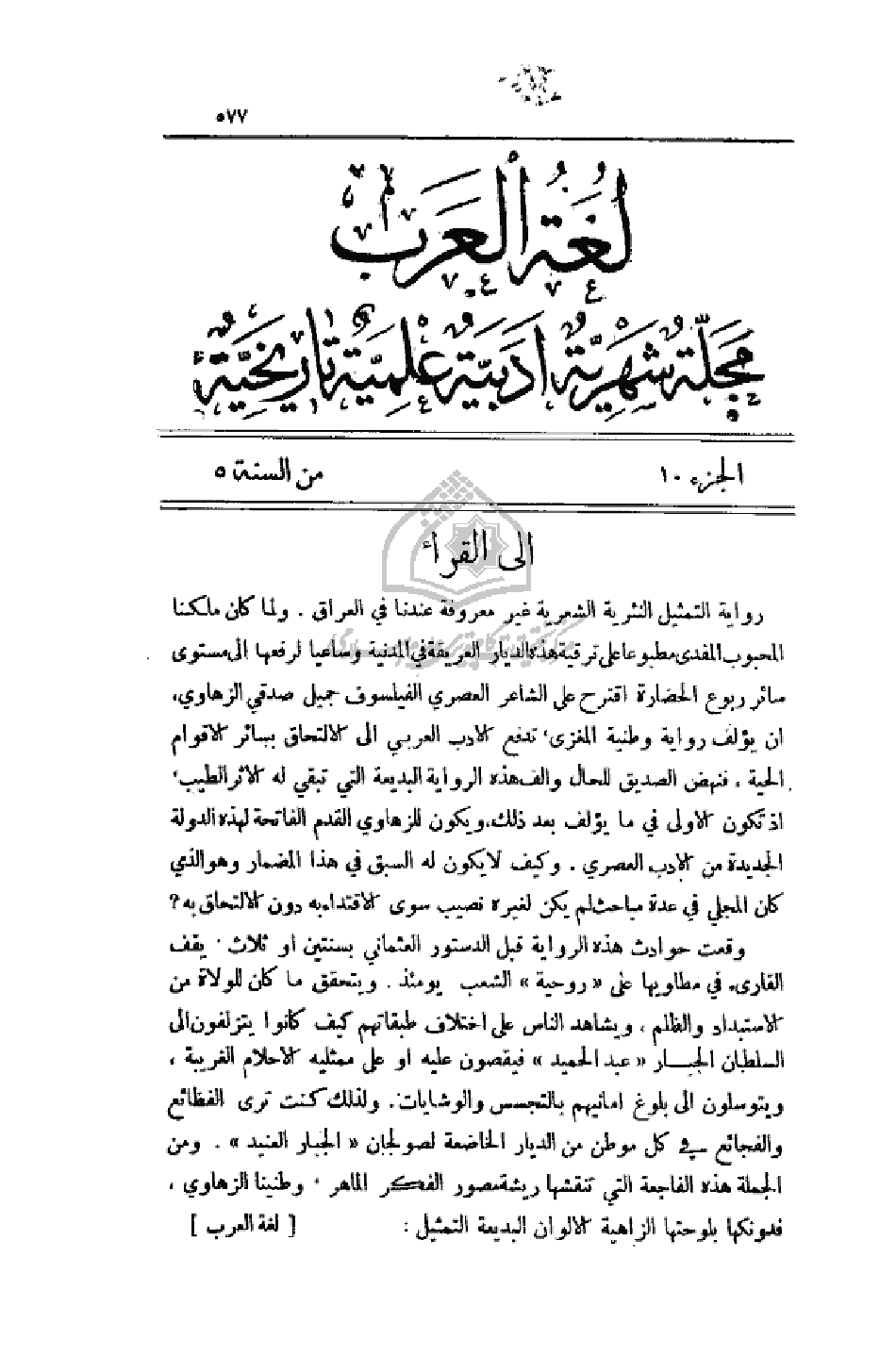رواية التمثيل النثرية الشعرية غير معروفة عندنا في العراق، ولما كان ملكنا المحبوب المفدى مطبوعاً على ترقية هذه الديار العريقة في المدينة وساعياً لرفعها إلى المستوى سائر ربوع الحضارة أقترح على الشاعر العصري الفيلسوف جميل صدقي الزهاوي، أن يؤلف رواية وطنية المغزى، تدفع الأدب العربي إلى الالتحاق بسائر الأقوام الحية، فنهض الصديق للحال وألف هذه الرواية البديعة التي تبقي له الأثر الطيب، إذ تكون الأولى في ما يؤلف بعد ذلك. ويكون للزهاوي القدم الفاتحة لهذه الدولة الجديدة من الأدب العصري. وكيف لا يكون له السبق في هذا المضمار وهو الذي كان المجلي في عدة مباحث لم يكن لغيره نصيب سوى الاقتداء به دون الالتحاق به؟