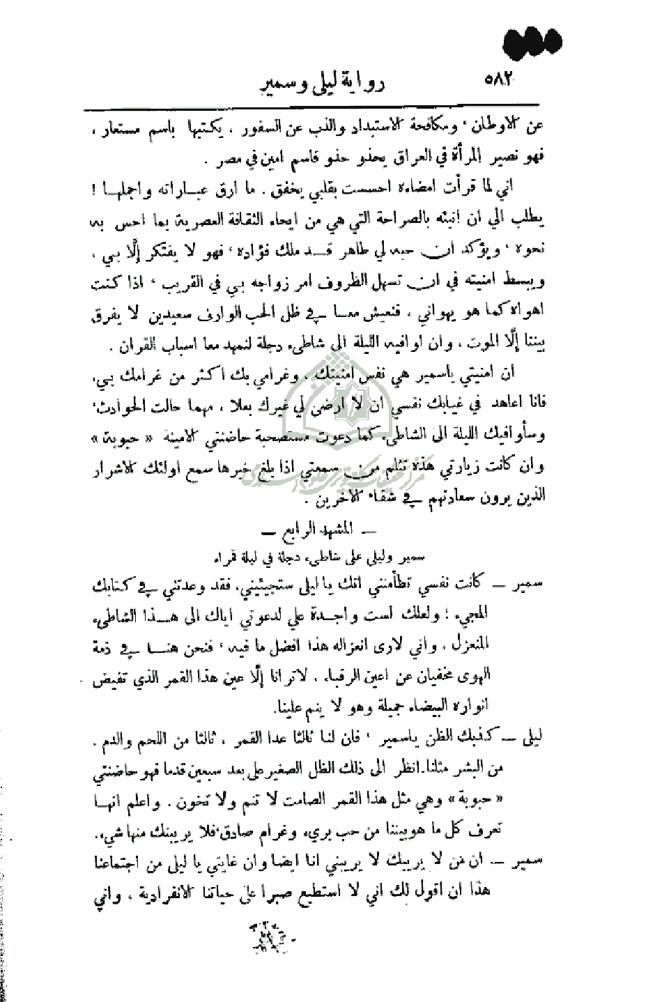 سمير - كانت نفسي تطمئنني أنك يا ليلى تجيئيني، فقد وعدتني في كتابك المجيء؛ ولعلك لست واجدة علي لدعوتي إياك إلى هذا الشاطئ المنعزل، وأني لأرى انعزاله هذا أفضل ما