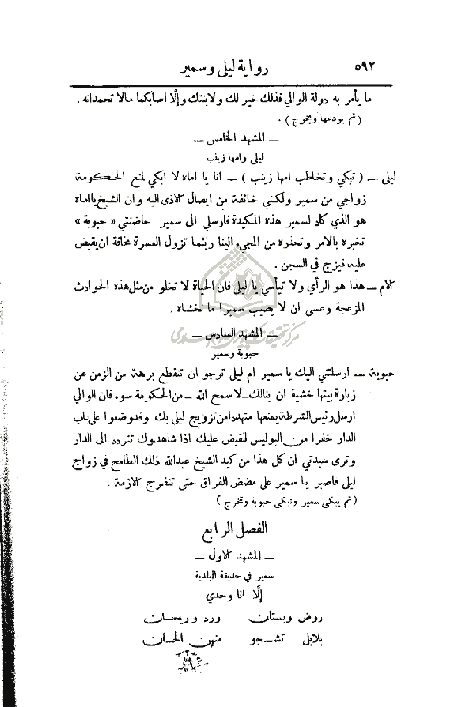 ليلى - (تبكي وتخاطب أمها زينب) - أنا يا أماه لا أبكي لمنع الحكومة زواجي من سمير ولكني خائفة من إيصال الأذى إليه وأن الشيخ يا أماه هو الذي كاد لسمير هذه المكيدة فأرسلي إلى سمير حاضنتي (حبوبة) تخبره بالأمر وتحذره من المجيء إلينا ريثما تزول العسرة مخافة أن يقبض عليه فيزج في السجن.
