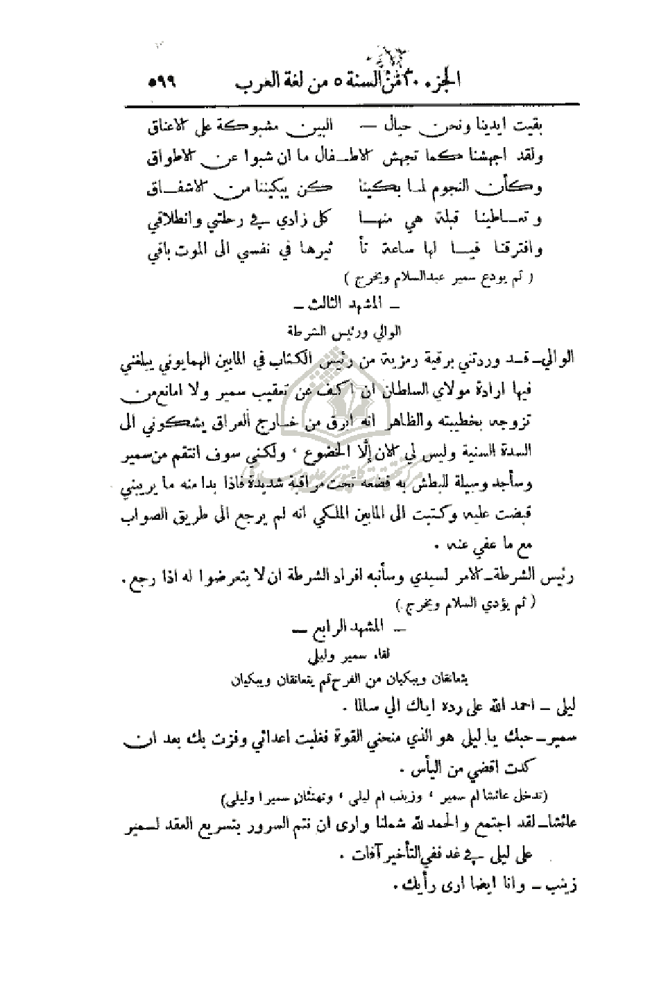 الوالي - قد وردتني برقية رمزية من رئيس الكتاب في المابين الهمايوني يبلغني فيها إرادة مولاي السلطان أن أكف عن تعقب سمير ولا أمانع من تزويجه بخطيبته والظاهر أنه أبرق من خارج العراق يشكوني إلى السدة السنية وليس لي الآن إلاَّ الخضوع، ولكني سوف أنتقم من سمير وسأجد وسيلة للبطش به فضعه تحت مراقبة شديدة فإذا بدا منه ما يريبني قبضت عليه وكتبت إلى المابين الملكي أنه لم يرجع إلى طريق الصواب مع ما عفي عنه.