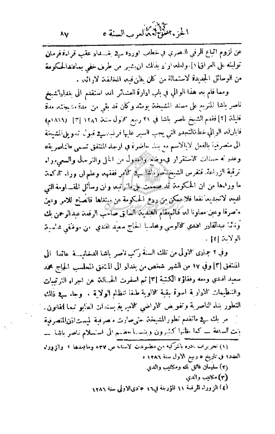 ومما قام به هذا الوالي في باب إدارة العشائر أنه أستقدم إلى بغداد الشيخ ناصر باشا المتربع على مسند المشيخة يومئذ وكان قد بقي من مدة مشيخته مدة قليلة فقدم الشيخ ناصر باشا في 21 ربيع الأول سنة 1286 (1869م) فأبان له الوالي خطة التجدد التي يجب السير عليها فرغبة في قبول تحويل المشيخة إلى متصرفية بالفعل لا بالاسم مع بناء حاضرة في أرجاء المنتفق تسمى (الناصرية) وعدد له حسنات الاستقرار في موضع والعدول عن الحل والترحال والسعي وراء ترقية الزراعة. فتفرس الشيخ ناصر باشا في الأمر ففقهه وعلم أم وراء الأكمة ما وراءها من أن الحكومة قد صممت على ما ترتبه وأن وسائل المقاومة التي لديه لا تجديه نفعاً فلا ممكن من ردع الحكومة عن مبتغاها فأنصاع للأمر وعين متصرفاً وعين معاوناً له قائم مقام الهندية السابق صاحب الرفعة عبد الرحمن بك ونائباً عبد القادر أفندي الآلوسي ومحاسباً الحاج سعيد أفندي من موظفي محاسبة الولاية.