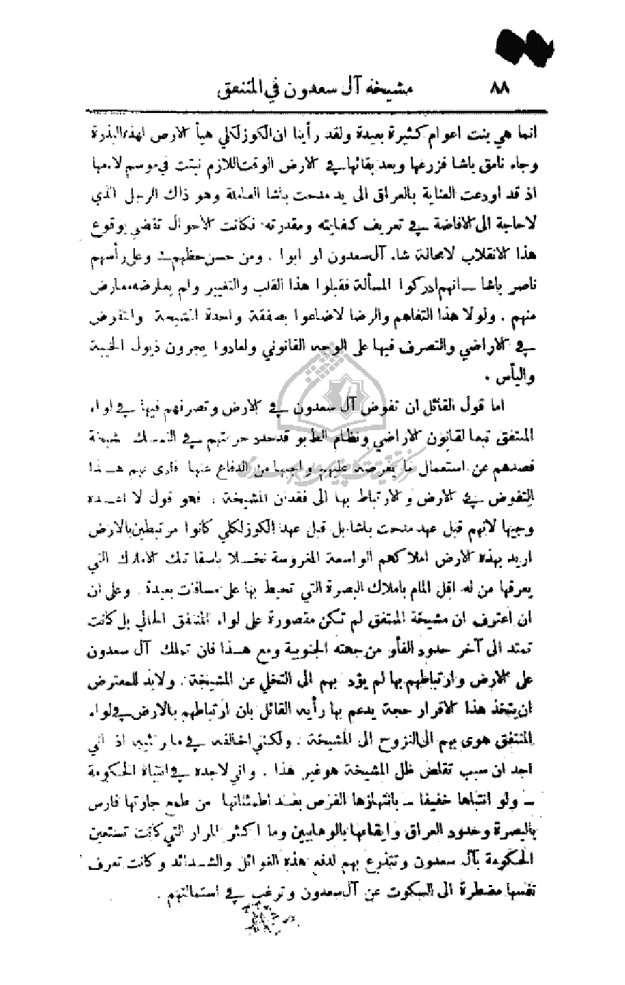 أما قول القائل أن تفوض آل سعدون في الأرض وتصرفهم فيها في لواء المنتفق تبعاً لقانون الأراضي ونظام الطابو قد حدد حربتهم في التمسك المشيخة فصدهم عن استعمال ما يفرضه عليهم واجبها من الدفاع عنها فأدى بهم هذا التفوض في الأرض والارتباط بها إلى فقدان المشيخة. فهو قول لا أعده وجيهاً لأنهم قبل عهد مدحت باشا بل قبل عهد الكوزلكلي كانوا مرتبطين بالأرض أريد بهذه الأرض أملاكهم الواسعة المغروسة نخلاً باسقاً تلك الأملاك التي يعرفها من له أقل المام بأملاك البصرة التي تحيط بها على مسافات بعيدة. وعلي أن أعترف أن مشيخة المنتفق لم تكن مقصورة على لواء المنتفق الحالي بل كانت تمتد إلى آخر حدود الفاو من جهته الجنوبية ومع هذا فأن تملك آل سعدون على الأرض وارتباطهم بها لم يؤد بهم إلى التخلي عن المشيخة. ولا بد للمعترض أن يتخذ هذا الإقرار حجة يدعم بها رأيه القائل بأن ارتباطهم بالأرض في لواء المنتفق هوى بهم إلى النزوح إلى المشيخة. ولكني أخالفه في ما ترتئيه إذ أني أجد أن سبب تقلص ظل المشيخة هو غير هذا. وأني لأجده في انتباه الحكومة