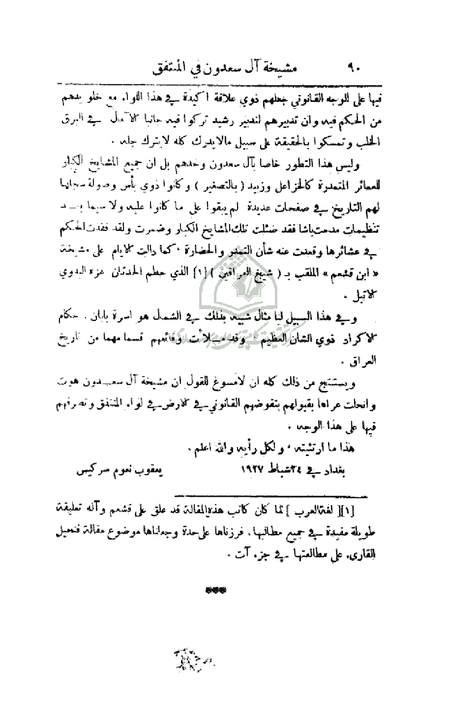 ويستنتج من ذلك كله أن لا مسوغ للقول أن مشيخة آل سعدون هوت وانحلت عراها بقبولهم بتفوضهم القانوني في الأرض لواء المنتفق وتصرفهم فيها على هذا الوجه.