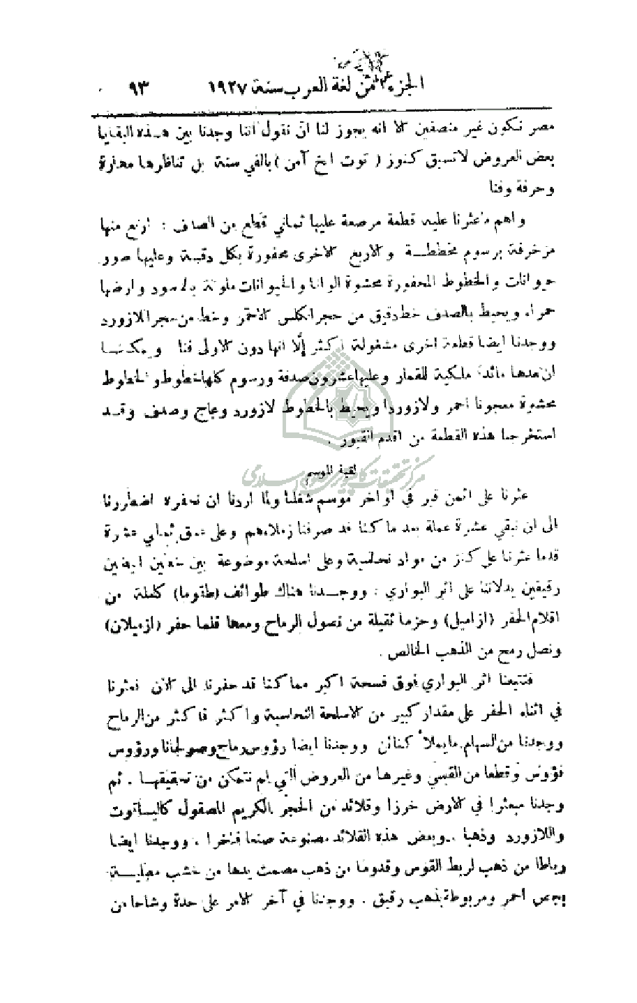 فتتبعنا أثر البواري فوق فسحة أكبر مما كنا قد حفرنا إلى الآن فعثرنا في أثناء الحفر على مقدار كبير من الأسلحة النحاسية وأكثر فأكثر من الرماح ووجدنا من السهام ما يملأ كنائن ووجدنا أيضاً رؤوس رماح وصولجاناً ورؤوس فؤوس وقطعاً من القسي وغيرها من العروض التي لم نتمكن من تحقيقها. ثم وجدنا مبعثراً في الأرض خرزاً وقلائد من الحجر الكريم المصقول كالياقوت واللازورد وذهباً، وبعض هذه القلائد مصنوعة صنعاً فاخراً، ووجدنا أيضاً رباطاً من ذهب لربط القوس وقدوماً من ذهب مصمت يدها من خشب مطلية بجص أحمر ومربوطة بذهب رقيق. ووجدنا في آخر الأمر على حدة وشاحاً من فضة ومعلقة به علبة من ذهب للحلي والعلبة مزخرفة ومخرمة. ووجدنا فيها منتاشاً (ملقط شعر صغير) على حاله وملعقة وخنجراً صغيراً. وكل هذه العروض من ذهب معلقة بخاتم من الفضة، ووجدنا أيضاً خنجراً آخر وهو لقية الموسم، مقبضه قطعة من لازورد مشبع اللون، وهو مرصع بالذهب، ونصله من ذهب مصقول، وغمده من ذهب مصمت، وخلف الغمد ساذج أو قل فيه خطان من الخرز البسيط، ووجهه قطعة من نقش مشبك. وهذا الخنجر باق على حالته الأصلية ولما أخرجناه من مدفنه - وكنا نخرجه رويداً رويدا - كان ذلك أحسن مكافأة لنا في هذا الفصل من السنة ولما بذلنا من الجد والسعي، ولو استخرج هذا الخنجر في أي عصر كان، لتعجبنا من مهارة صناعته وصياغته فكيف لا نتعجب حين نعلم أنه صنع قبل 550 سنة؟ فهو بلا شك من أقدم نموذج من الصياغة.