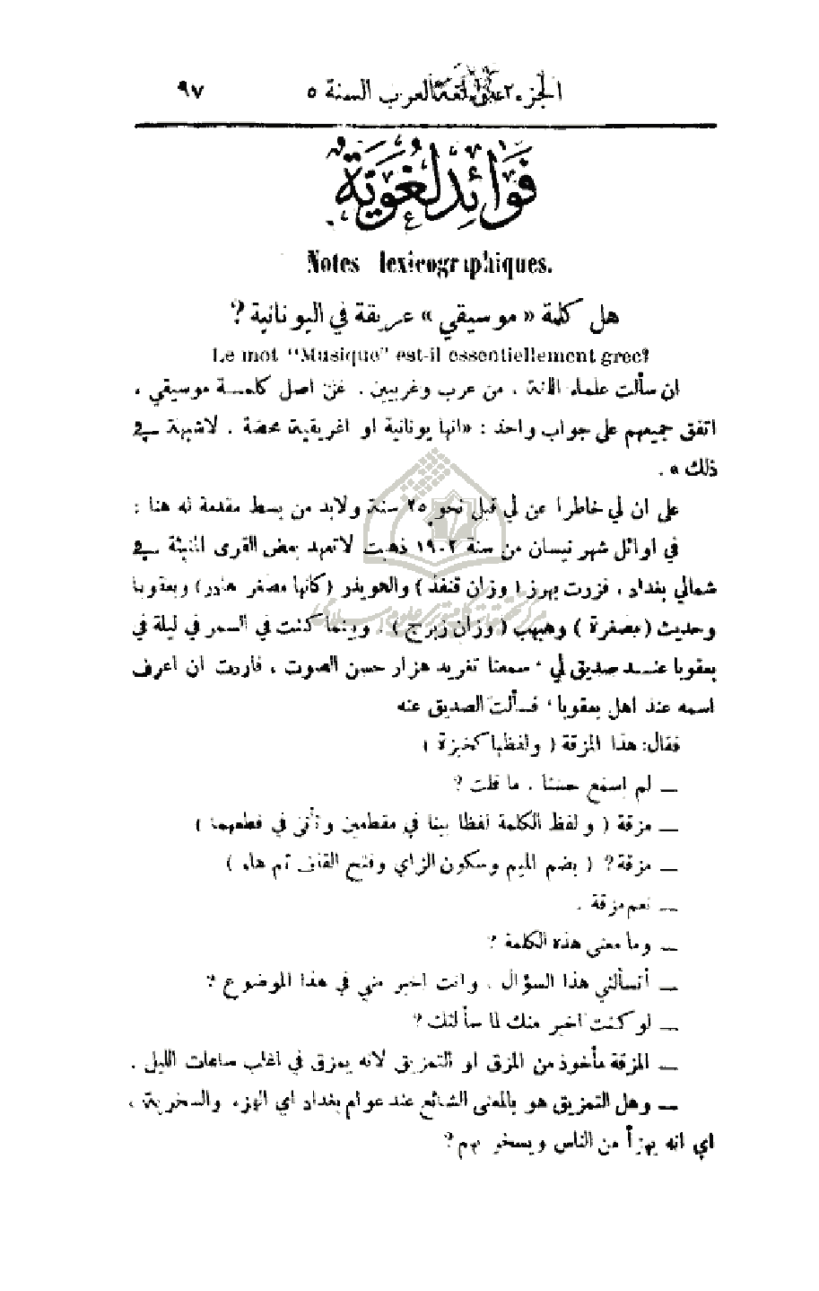 أن سألت علماء اللغة، من عرب وغربيين، عن أصل كلمة موسيقي، أتفق جميعهم على جواب واحد: (أنها يونانية أو إغريقية محضة. لا شبهة في ذلك).
