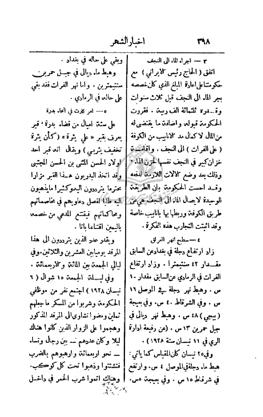زاد ارتفاع دجلة في بغداد عن السابق مقدار 42 سنتمترا. وزاد ارتفاع الفرات في الرمادي عن السابق مقدار 10 س. وهبط نهر دجلة في الموصل 16 س. وفي الشرقاط 40 س. وفي بعيجة (بيجي) 48 س. وهبط نهر ديالى في جبل حمرين 13 س. (عن رفيعة إدارة الري في 11 نيسان سنة 1928).