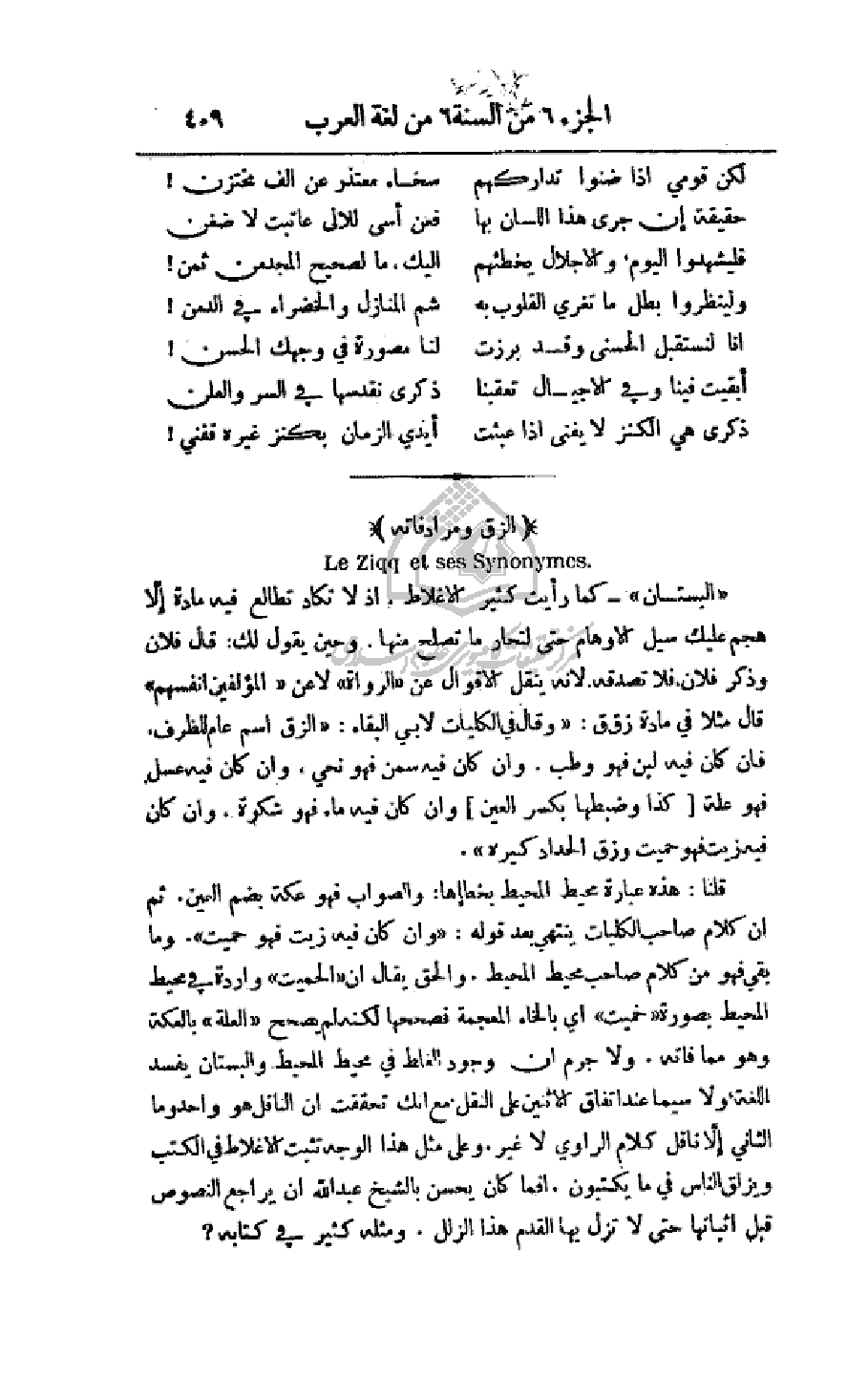 قلنا: هذه عبارة محيط المحيط بخطئها: والصواب فهو عكة بضم العين. ثم أن كلام صاحب الكليات ينتهي بعد قوله: (وان كان فيه زيت فهو حميت). وما بقي فهو من كلام صاحب محيط المحيط. والحق يقال أن (الحميت) واردة في محيط المحيط بصورة (خميت) أي بالخاء المعجمة نصححها لكنه لم يصحح (العلة) بالعكة وهو مما فاته. ولا جرم أن وجود الغلط في محيط المحيط والبستان يفسد اللغة، ولا سيما عند اتفاق الاثنين على النقل، مع انك تحققت أن الناقل هو واحد وما الثاني إلا ناقل كلام الراوي لا غير. وعلى مثل هذا الوجه تثبت الأغلاط في الكتب ويزلق الناس في ما يكتبون. أفما كان يحسن بالشيخ عبد الله أن يراجع النصوص قبل إثباتها حتى لا تزل بها القدم هذا الزلل. ومثله كثير في كتابه؟