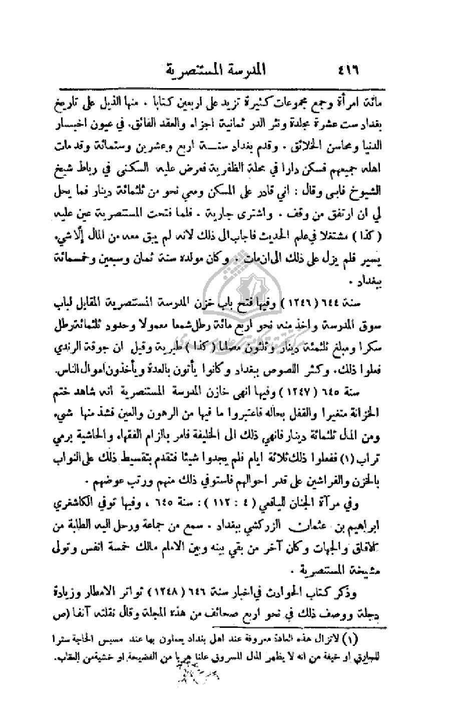 سنة 645 (1247) وفيها أنهى خازن المدرسة المستنصرية أنه شاهد ختم الخزانة متغيرا والقفل بحاله فاعتبروا ما فيها من الرهون والعين فشذ منها شئ ومن المال ثلاثمائة دينار فانهي ذلك إلى الخليفة فأمر بإلزام الفقهاء والحاشية برمي تراب ففعلوا ذلك ثلاثة أيام فلم يجدوا شيئا فتقدم بتقسيط ذلك على النواب بالخزن والفراشين على قدر أحوالهم فاستوفي