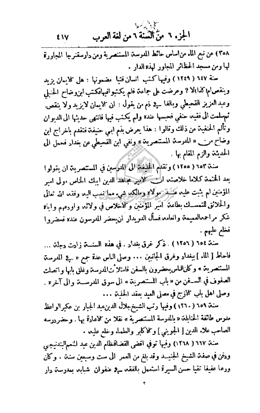 سنة 659 (1260) وفيها رتب الشيخ جلال الدين عبد الجبار بن عكبر الواعظ مدرسة
