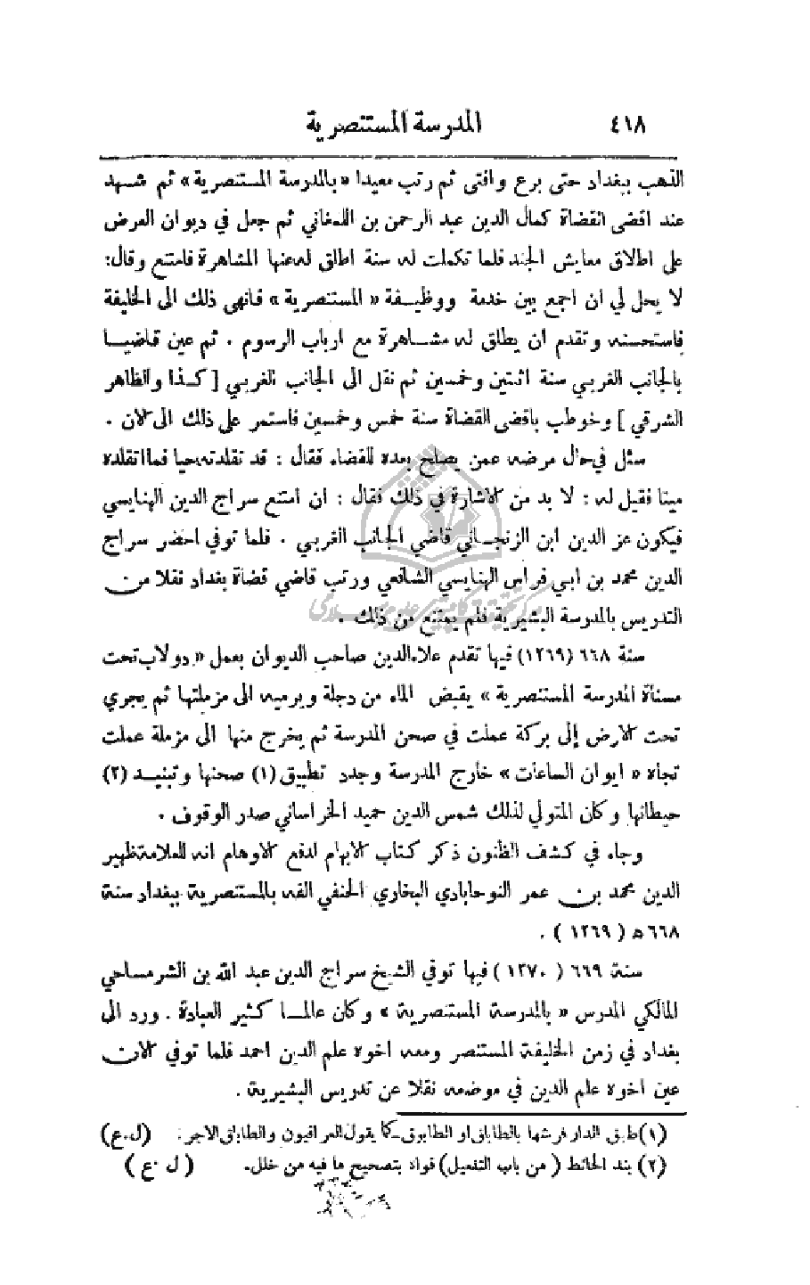 سنة 669 (1270) فيها توفي الشيخ سراج الدين عبد الله بن الشرمساحي المالكي المدرس (بالمدرسة المستنصرية) وكان عالما كثير العبادة. ورد إلى بغداد في زمن الخليفة المستنصر ومعه أخوه علم الدين أحمد فلما توفي الآن عين أخوه علم الدين في موضعه نقلا