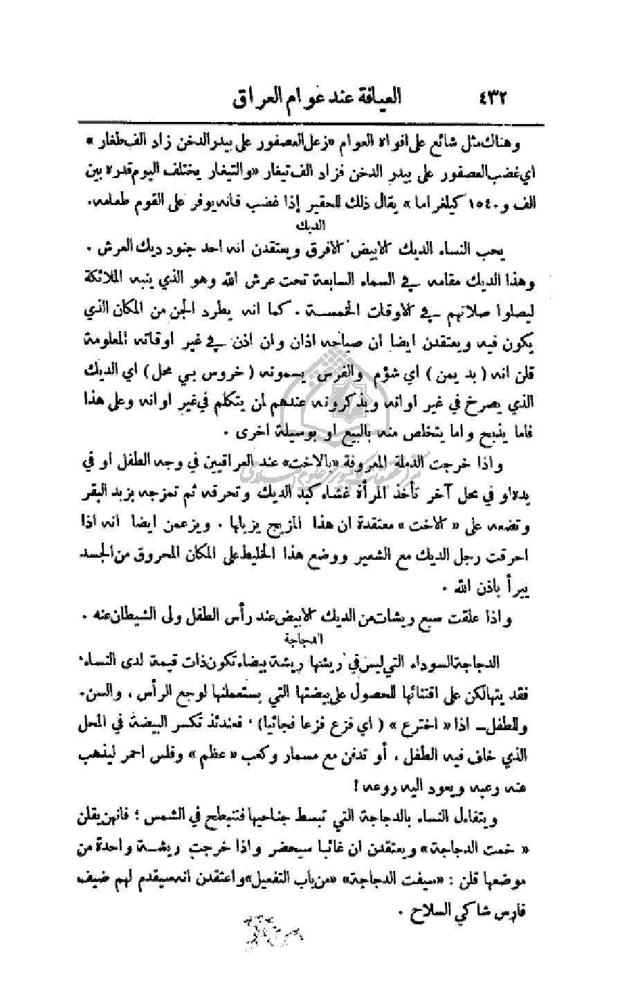 يحب النساء الديك الأبيض الأفرق ويعتقدون أنه أحد جنود ديك العرش. وهذا الديك مقامه في السماء السابعة تحت عرش الله وهو الذي ينبه الملائكة ليصلوا صلاتهم في الأوقات الخمسة. كما أنه يطرد الجن من المكان الذي يكون فيه ويعتقدن أيضاً أن صياحه آذان وإن في غير أوقاته المعلومة قلن أنه (بد يمن) أي شؤم والفرس يسمونه (خروس بي محل) أي الديك الذي يصرخ في غير أوانه ويذكرونه عندهم لمن يتكلم في غير أوانه وعلى هذا فأما يذبح وأما يتخلص منه بالبيع أو بوسيلة أخرى.