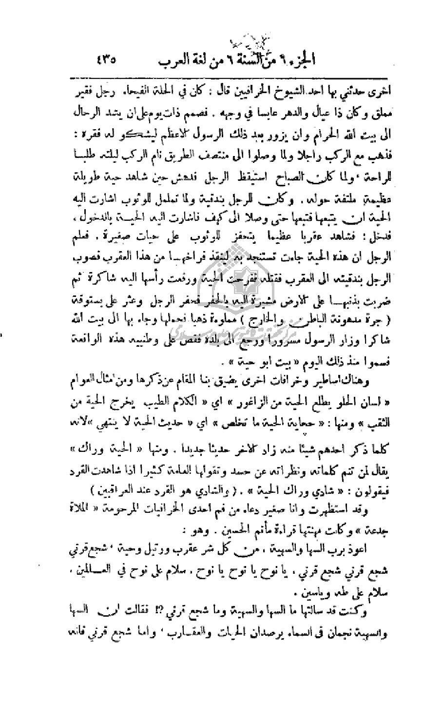 أخرى حدثني بها الشيوخ الخرافيين قال: كان في الحلة الفيحاء رجل فقير مملق وكان ذا عيال والدهر عابسا في وجهه. فصمم ذات يوم على أن يشد الرحال إلى بيت الله الحرام وإن يزور بعد ذلك الرسول الأعظم ليشكو له فقره: فذهب مع الركب راجلا ولما وصلوا إلى منتصف الطريق نام الركب ليلته طلبا للراحة، ولما كان الصباح استيقظ الرجل فدهش حين شاهد حية طويلة عظيمة ملتفة حوله. وكان للرجل بندقية ولما تململ للوثوب أشارت إليه الحية أن يتبعها فتبعها حتى وصلا إلى كهف فأشارت إليه الحية بالدخول، فدخل؛ فشاهد عقربا عظيما يتحفز للوثوب على حيات صغيرة، فعلم الرجل أن هذه الحية جاءت تستنجد به لينقذ فراخها من هذا العقرب فصوب الرجل بندقيته إلى العقرب فقتله ففرحت الحية ورفعت رأسها إليه شاكرة ثم ضربت بذنبها