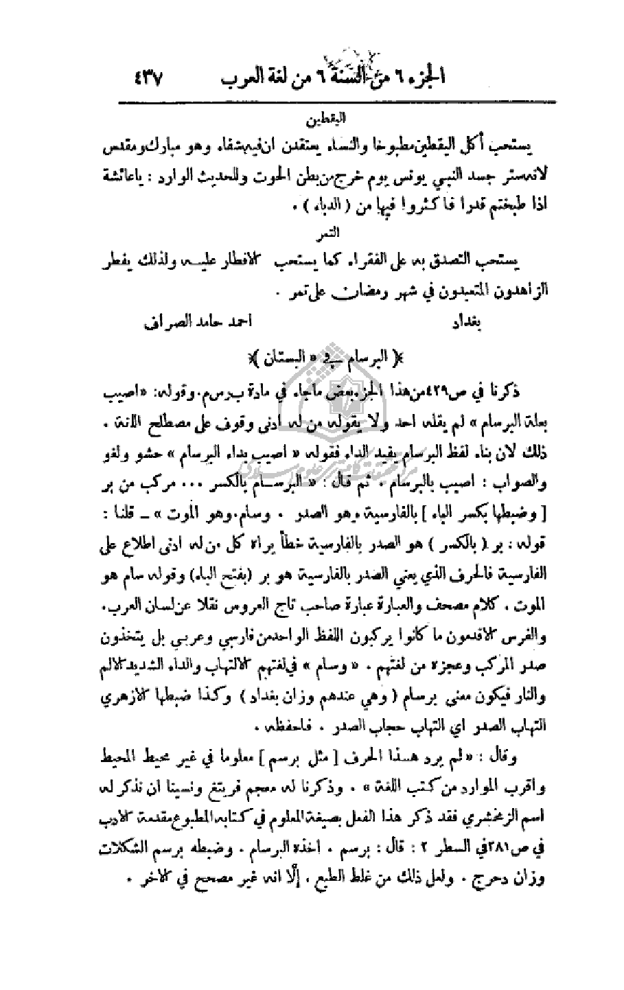 ذكرنا في ص 429 من هذا الجزء بعض ما جاء في مادة ب ر س م. وقوله: (أصيب بعلة البرسام) لم يقله أحد ولا يقوله من له أدنى وقوف على مصطلح اللغة. ذلك لأن بناء لفظ البرسام يفيد الداء فقوله (أصيب بداء البرسام) حشو ولغو والصواب: أصيب بالبرسام. ثم قال: (البرسام بالكسر. . . مركب من بر (وضبطها بكسر الباء) بالفارسية وهو الصدر. وسام. وهو الموت) - قلنا: قوله: بر (بالكسر) هو الصدر بالفارسية خطأ يراه كل من له أدنى الفارسية فالحرف الذي يعني الصدر بالفارسية هو بر (بفتح الباء) وقوله سام هو الموت، كلام مصحف والعبارة عبارة صاحب تاج العروس نقلا عن لسان العرب، والفرس الأقدمون ما كانوا يركبون اللفظ الواحد من فارسي وعربي بل يتخذون صدر المركب وعجزه من لغتهم. (وسام) في لغتهم الالتهاب والداء لشديد الألم والنار فيكون برسام (وهي عندهم وزان بغداد) وكذا ضبطها الأزهري التهاب الصدر أي التهاب حجاب الصدر. فاحفظه.