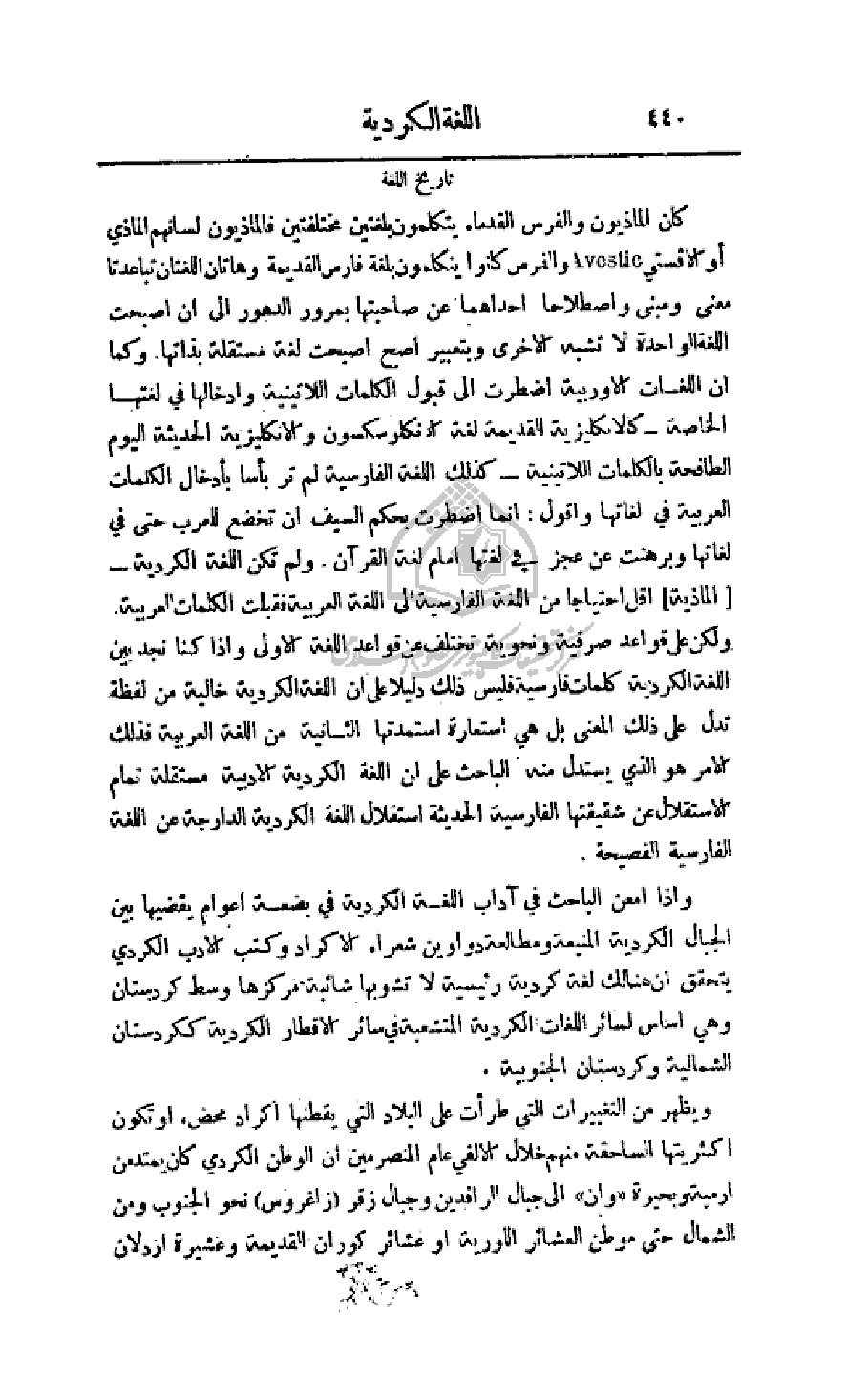 كان الماذيون والفرس القدماء يتكلمون بلغتين مختلفتين فالماذيون لسانهم الماذي أو الافستي والفرس كانوا يتكلمون بلغة فارس القديمة وهاتان اللغتان تباعدتا معنى ومبنى واصطلاحا أحدهما عن صاحبتها بمرور الدهور إلى أن أصبحت اللغة الواحدة لا تشبه الأخرى وبتعبير اصح أصبحت لغة مستقلة بذاتها. وكما أن اللغات الأوربية اضطرت إلى قبول الكلمات اللاتينية وإدخالها في لغتها الخاصة - كالإنكليزية القديمة لغة الانكلوسكسون والإنكليزية الحديثة اليوم الطافحة بالكلمات اللاتينية - كذلك اللغة الفارسية لم تر بإدخال الكلمات العربية في لغاتها وأقول: إنما اضطرت بحكم السيف أن تخضع للعرب حتى في لغاتها وبرهنت عن عجز في لغتها أمام لغة القرآن. ولم تكن اللغة الكردية - (الماذية) أقل احتياجا من اللغة الفارسية إلى العربية فقبلت الكلمات العربية ولكن على قواعد صرفية