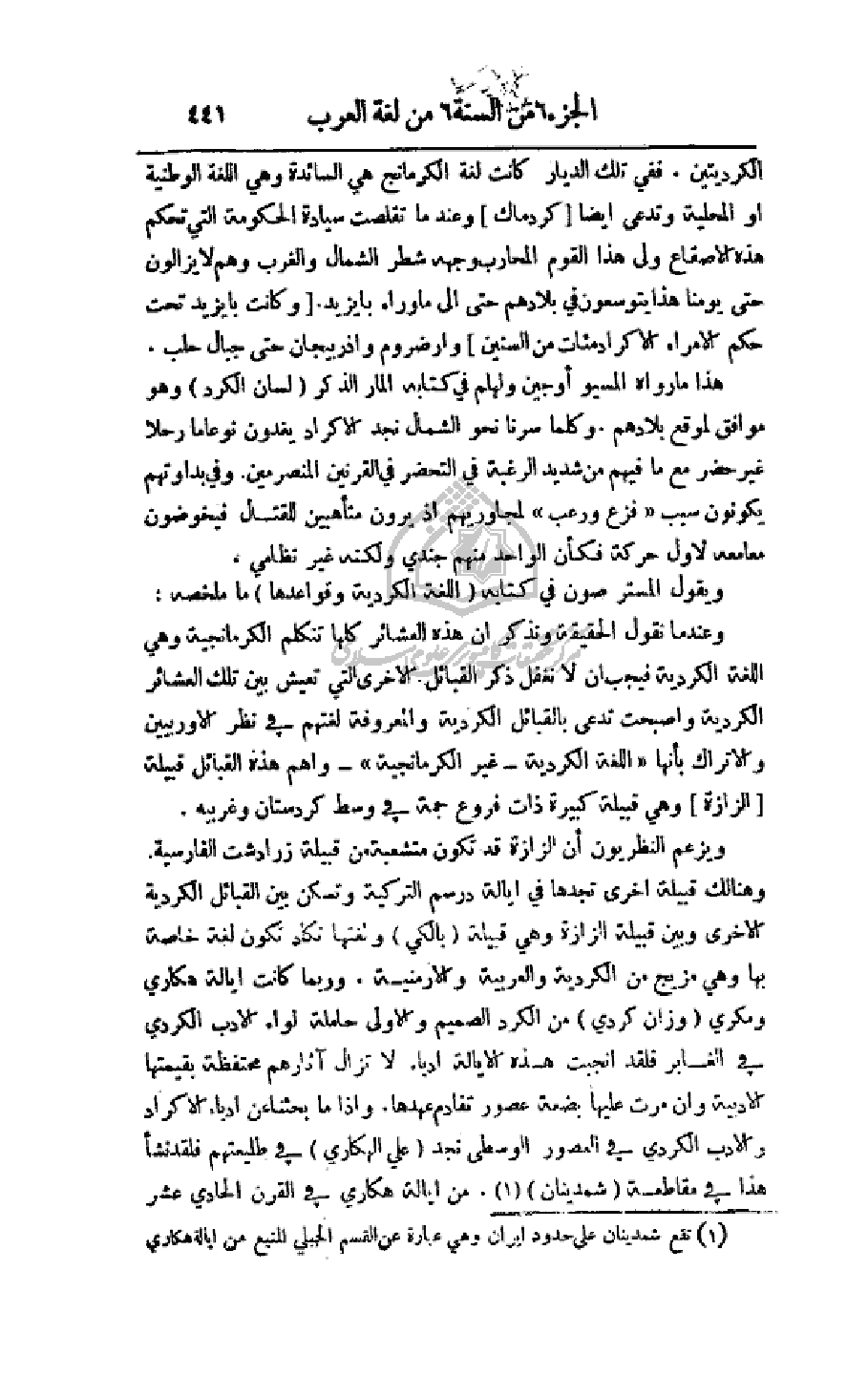 الكرديتين. ففي تلك الديار كانت لغة الكرمانج هي السائدة وهي اللغة الوطنية أو المحلية وتدعى أيضاً (كردماك) وعندما تقلصت سيادة الحكومة التي تحكم هذه الأصقاع ولى هذا القوم المحارب وجهة شطر الشمال والغرب وهم لا يزالون حتى يومنا هذا يتوسعون في بلادهم حتى إلى ما وراء بايزيد. (وكانت بايزيد تحت حكم الأمراء الأكراد مئات من السنين) وارضروم وأذربيجان حتى جبال حلب.