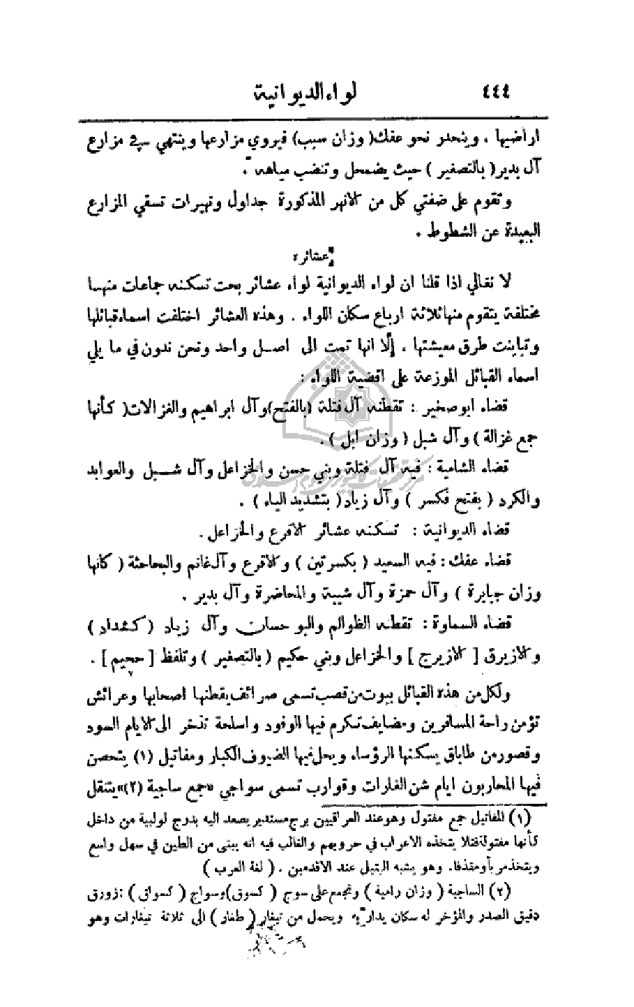 لا نغالي إذا قلنا أن لواء الديوانية لواء عشائر بحت تسكنه جماعات منها مختلفة يتقوم منها ثلاثة أرباع سكان اللواء. وهذه العشائر اختلفت أسماء قبائلها وتباينت طرق معيشتها، إلا أنها تمت إلى اصل واحد ونحن ندون في ما يلي اسماه القبائل الموزعة على اقضية اللواء: