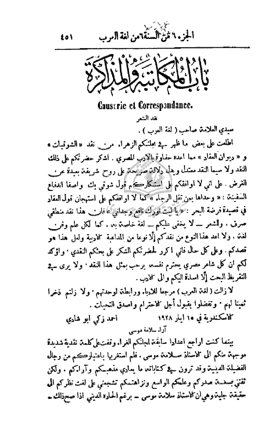 بينما كنت أراجع أعدادا سابقة لمجلتكم الغراء وقفت على كلمة نقدية شديدة موجهة منكم إلى الأستاذ سلامة موسى، فلم استغربها باعتباركم من رجال الفضيلة الدينية وقد ترون في كتاباته ما يعادي مذهبكم وآراءكم. ولكن ثقتي بسعة صدركم وعلمكم الواسع ونزهتكم تشجعني على لفت نظركم إلى حقيقة جلية وهي أن الأستاذ موسى - برغم الحادة الديني إذا صح ذلك -