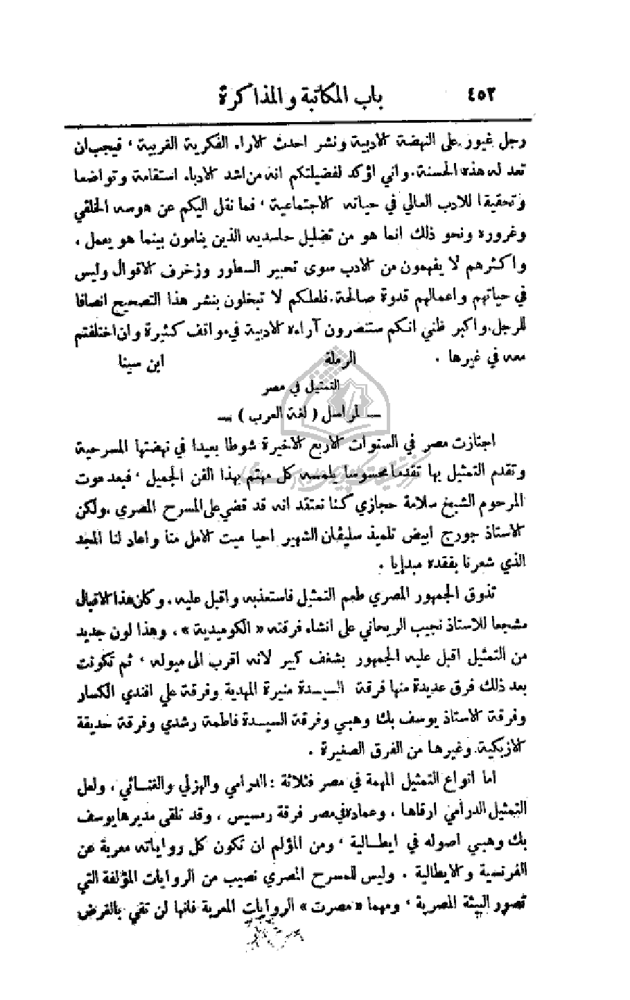 أما أنواع التمثيل المهمة في مصر فثلاثة: الدرامي والهزلي والغنائي، ولعل التمثيل الدرامي أرقاها، وعماده في مصر فرقة رمسيس، وقد تلقى مديرها يوسف بك وهبي أصوله في إيطالية، ومن المؤلم أن تكون كل رواياته معربة عن الفرنسية والإيطالية. وليس للمسرح المصري نصيب من الروايات المؤلفة التي تصور البيئة المصرية، ومهما (مصرت) الروايات المعربة فأنها لن تفي بالغرض