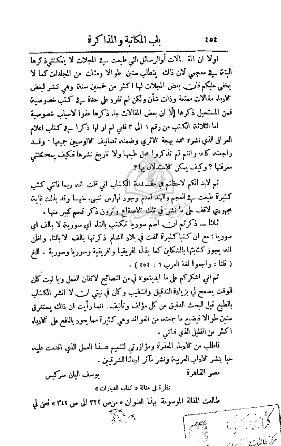 ثم أني أشكركم على ما أبديتموه لي من النصائح لإتقان العمل ويا ليت كان الوقت يسمح لي بزيادة التدقيق والتنقيب وكان في نيتي أن لا انشر الكتاب بالطبع قبل البحث الدقيق عن كل مؤلف وتأليف. إنما رأيت أن يستغرق سنين طوالا فيضيع ما جمعته من الفوائد وهي كثيرة مما بالنفع على الأدباء أكثر من القليل الذي فاتني.