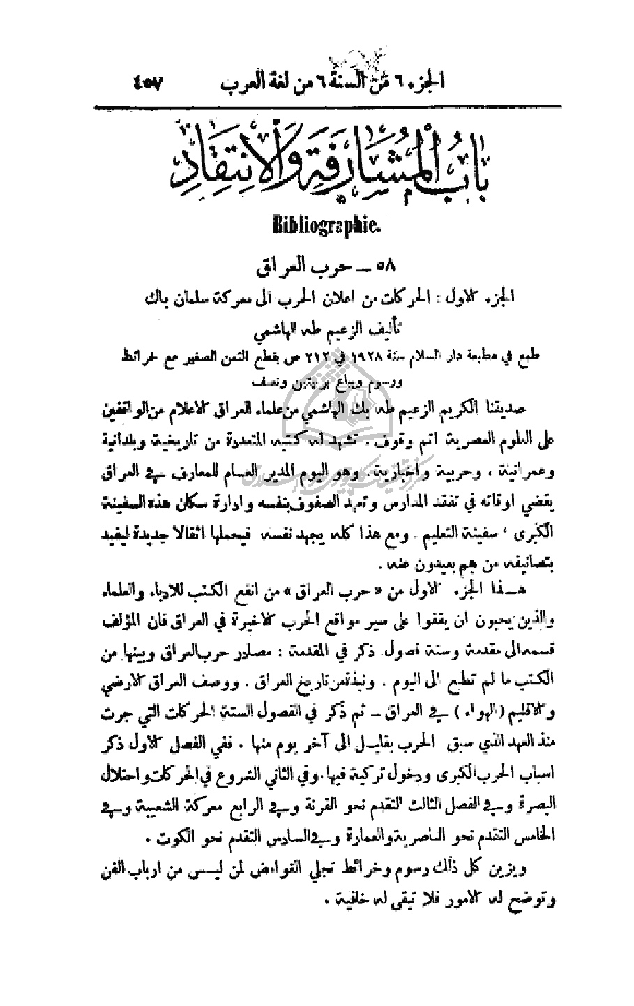 صديقنا الكريم الزعيم طه بك الهاشمي من علماء العراق الأعلام من الواقفين على العلوم العصرية أتم وقوف. تشهد له كتبه المتعددة من تاريخية وبلدانية وعمرانية، وحربية وإخبارية وهو اليوم المدير العام للمعارف في العراق يقضي أوقافه في تفقد المدراس وتعهد الصفوف بنفسه وإدارة سكان هذه السفينة الكبرى، سفينة التعليم. ومع هذا كله يجهد نفسه فليحمها أثقالا جديدة ليفيد بتصانيفه من هم بعيدون عنه.