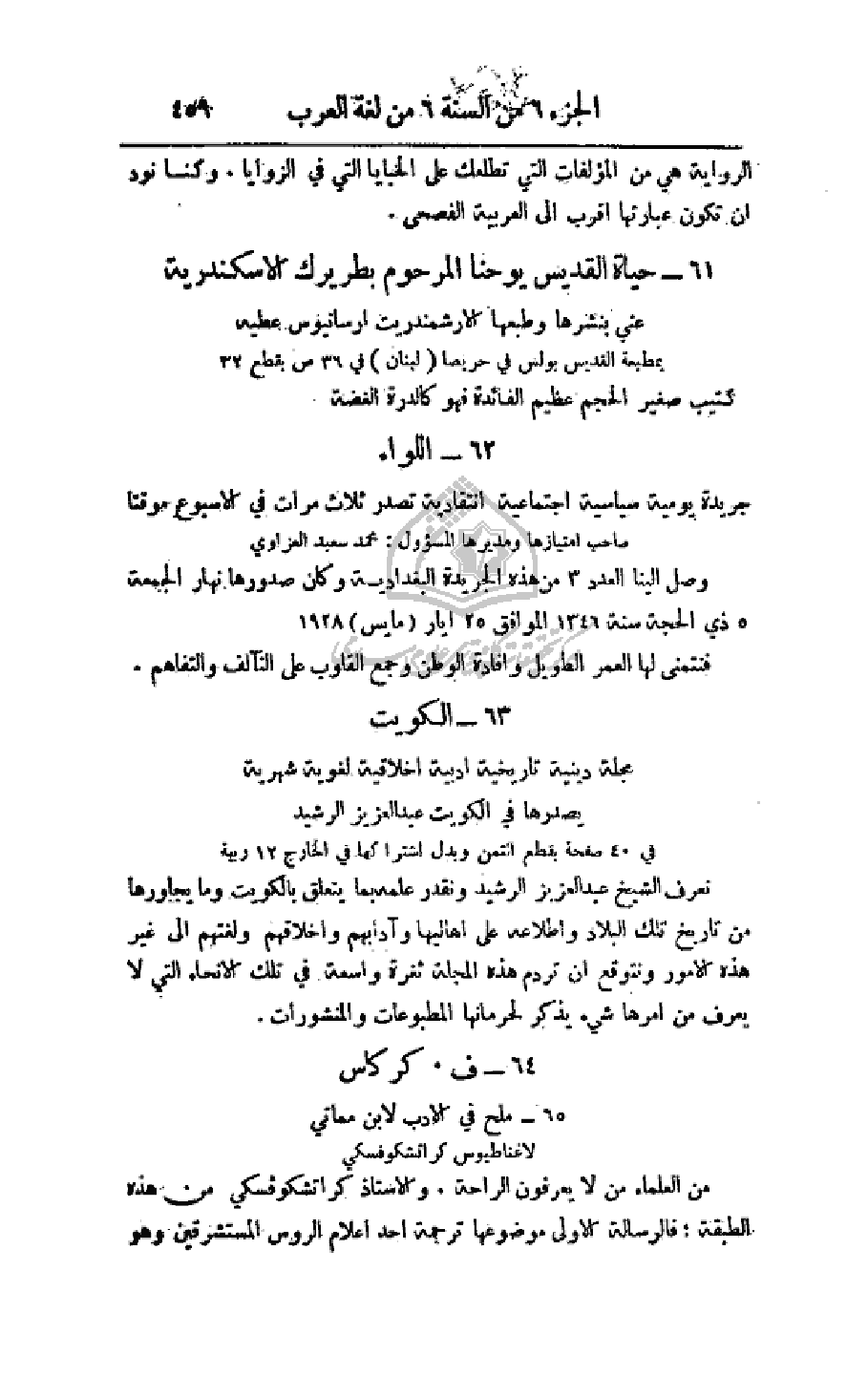 من العلماء من لا يعرفون الراحة. والأستاذ كراتشكوفسكي من هذه الطبقة؛ فالرسالة الأولى موضوعها ترجمة أحد أعلام الروس المستشرقين وهو