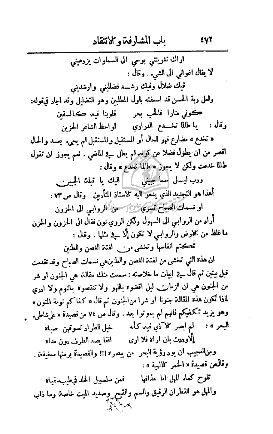 أن هذه التي تخشى من لفتة الغصن والطين هي نسمات الصباح وقد تقدمت قبل بيتين ثم قال في أبيات ما خلاصته: سمعت منك مقالة هي الجنون أو شر من الجنون هي أن الزمان ليل اقضوه باللهو ولا تنقصوه بالنوم ولا أدري لماذا تكون هذه المقالة جنونا أو شرا من الجنون ثم قال (كفاكم نومة المنون) وهو يريد تكفيكم فانهم لم يموتوا بعد وقال ص 74 من قصيدة (على شاطئ البحر)