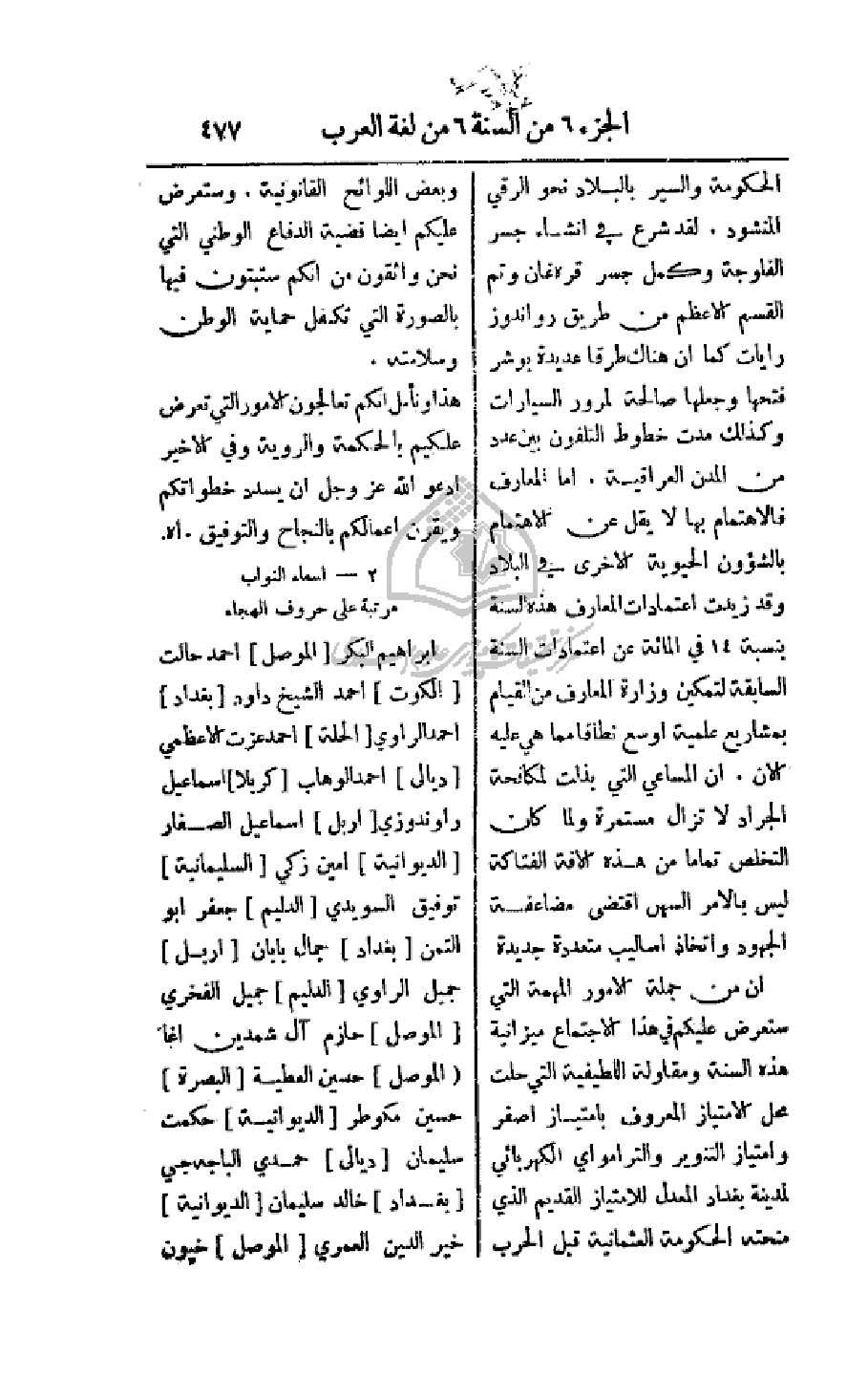 إن من جملة الأمور المهمة التي ستعرض عليكم في هذا الاجتماع ميزانية هذه السنة ومقاولة اللطيفية التي حلت محل الامتياز المعروف بامتياز أصفر وامتياز التنوير والترامواي الكهربائي لمدينة بغداد المعدل للامتياز القديم الذي منحته الحكومة العثمانية قبل الحرب وبعض اللوائح القانونية. وستعرض عليكم أيضاً قضية الدفاع الوطني التي نحن واثقون أنكم ستبتون فيها بالصورة التي تكفل حماية الوطن وسلامته.