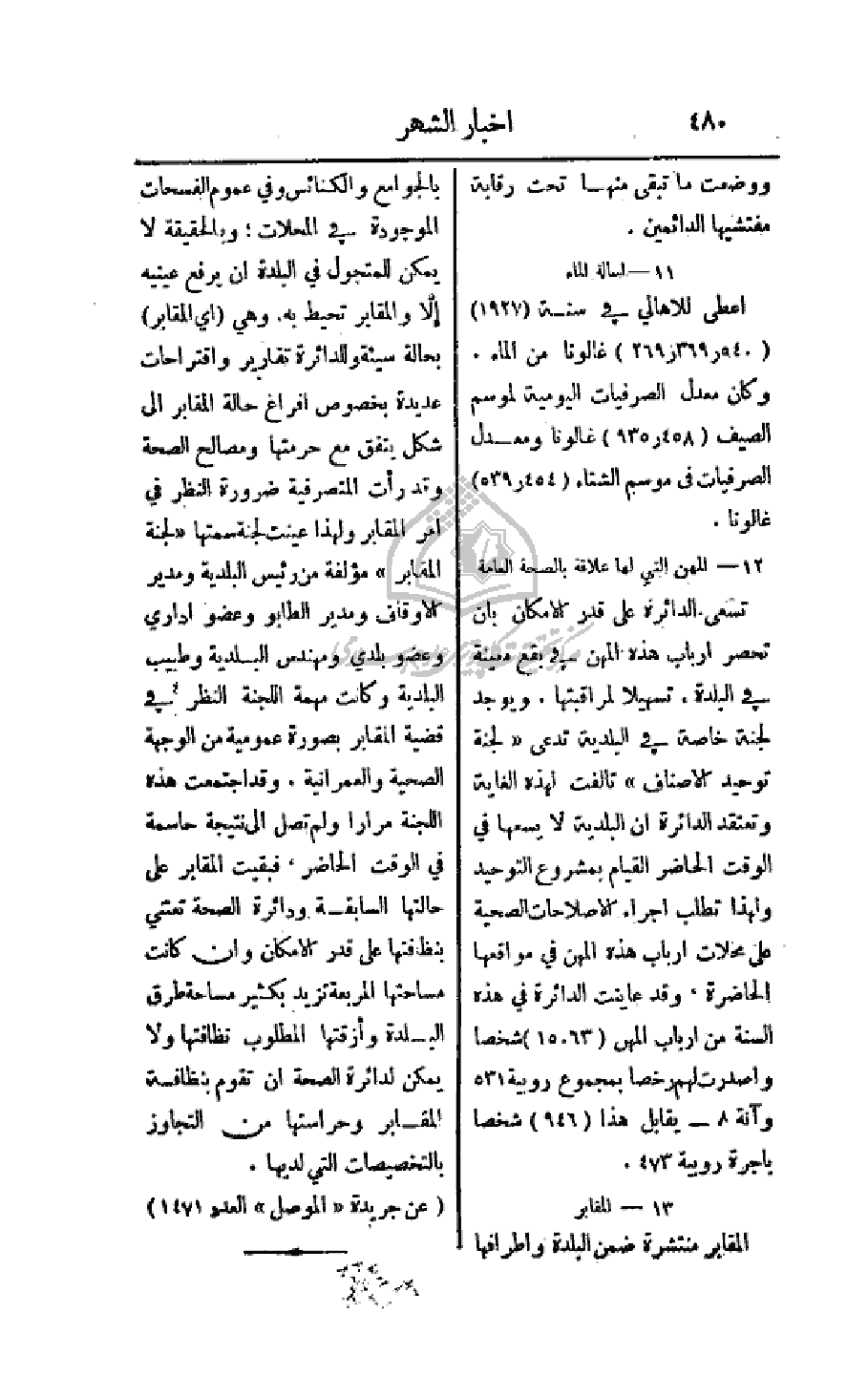 تسهيلا لمراقبتها. ويوجد لجنة خاصة في البلدية تدعى (لجنة خاصة توحيد الأصناف) تألفت لهذه الغاية وتعتقد الدائرة أن البلدية لا يسعها في الوقت الحاضر القيام بمشروع التوحيد ولهذا تطلب أجراء الإصلاحات الصحية على محلات أرباب هذه المهن في مواقعها الحاضرة، وقد عاينت الدائرة في هذه السنة من أرباب المهن (15063) شخصا وأصدرت لهم رخصا بمجموع روبية 531 وأنة 8 - يقابل هذا (946) شخصا باجرة روبية 473.