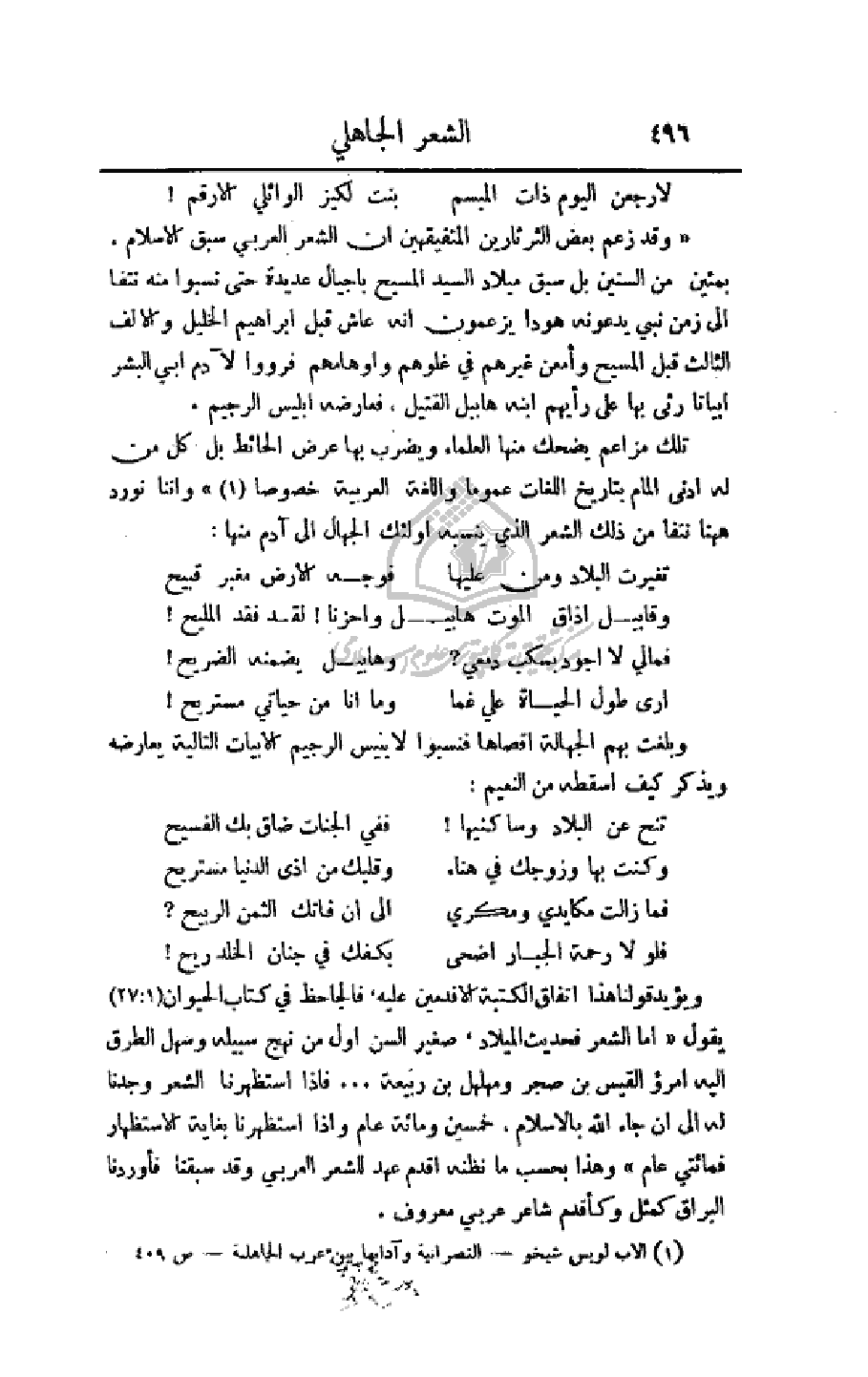 (وقد زعم بعض الثرثارين المتفيقهين أن الشعر العربي سبق الإسلام، بمئين من السنين بل سبق ميلاد المسيح بأجيال عديدة حتى نسبوا منه نتفا إلى زمن نبي يدعونه هودا يزعمون أنه عاش قبل إبراهيم الخليل والألف الثالث قبل المسح وأمعن غيرهم في غلوهم وأوهامهم فرووا لآدم أبي البشر أبياتا رثى بها على رأيهم ابنه هابيل القتيل، فعارضه إبليس الرجيم.
