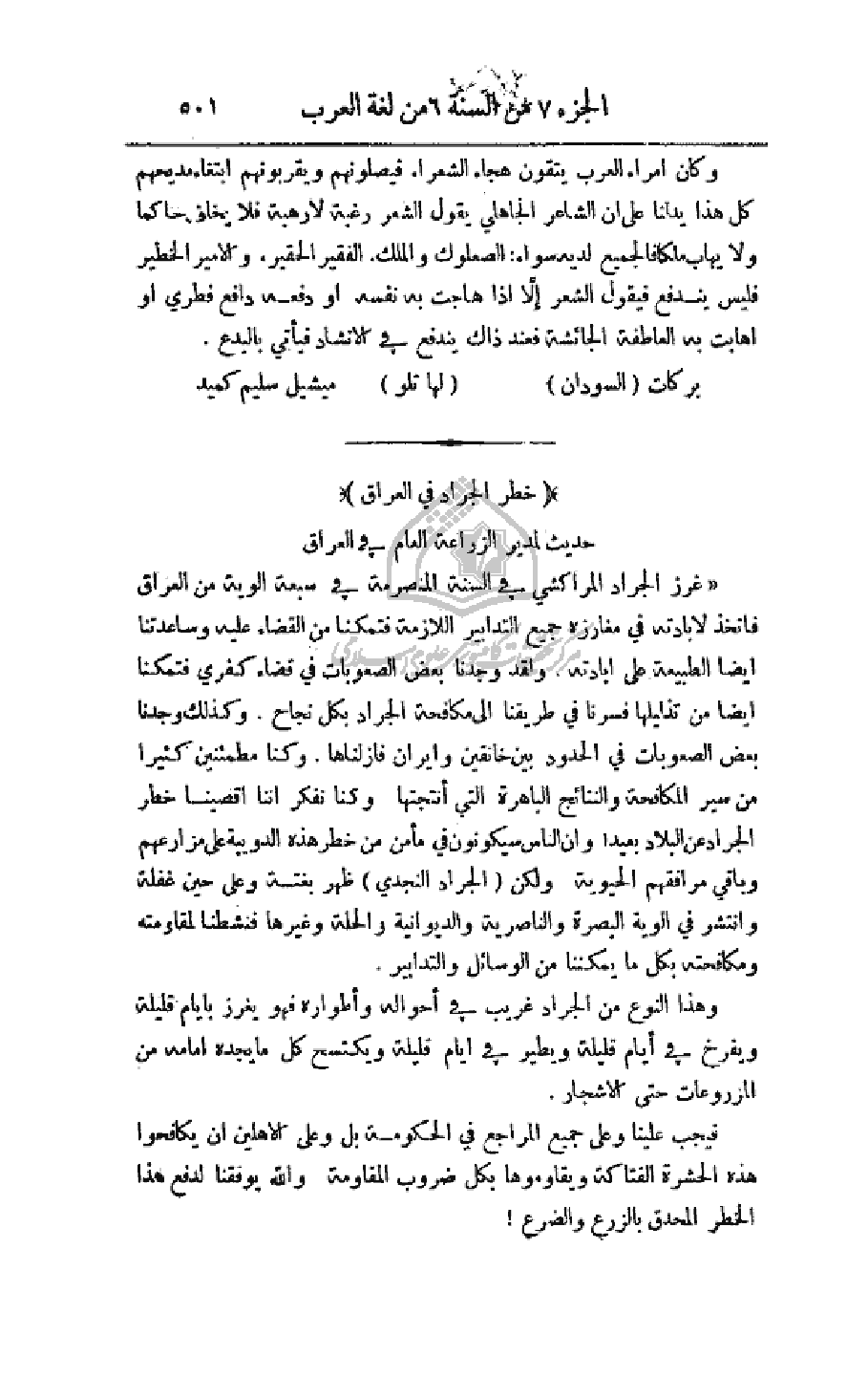 فيجب علينا وعلى جميع المراجع في الحكومة بل وعلى الاهلين أن يكافحوا هذه الحشرة الفتاكة ويقاوموها بكل ضروب المقاومة والله يوفقنا لدفع هذا الخطر المحدق بالزرع والضرع!