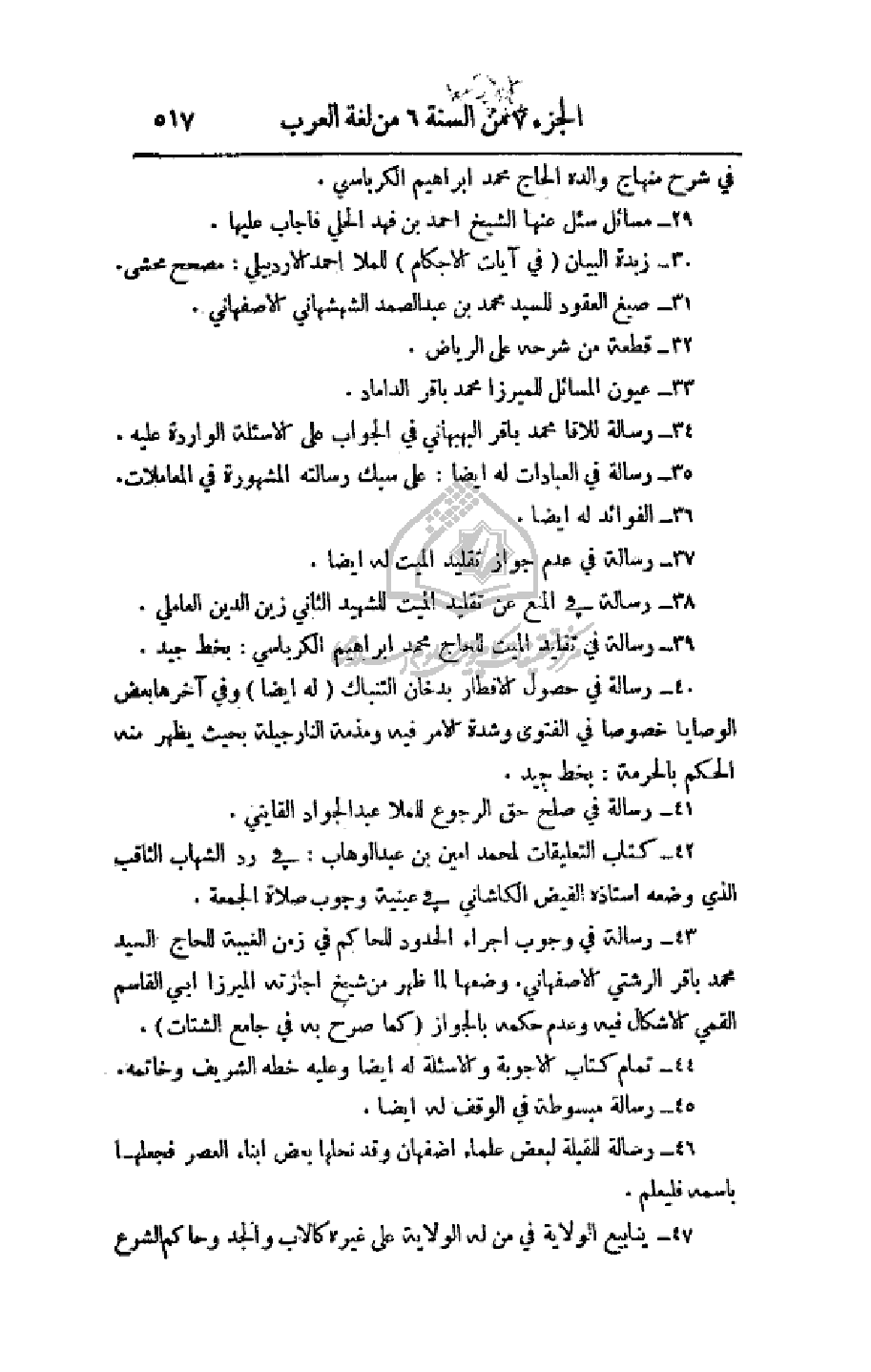 44 - تمام كتاب الأجوبة والأسئلة له أيضاً وعليه خطه الشريف وخاتمه.