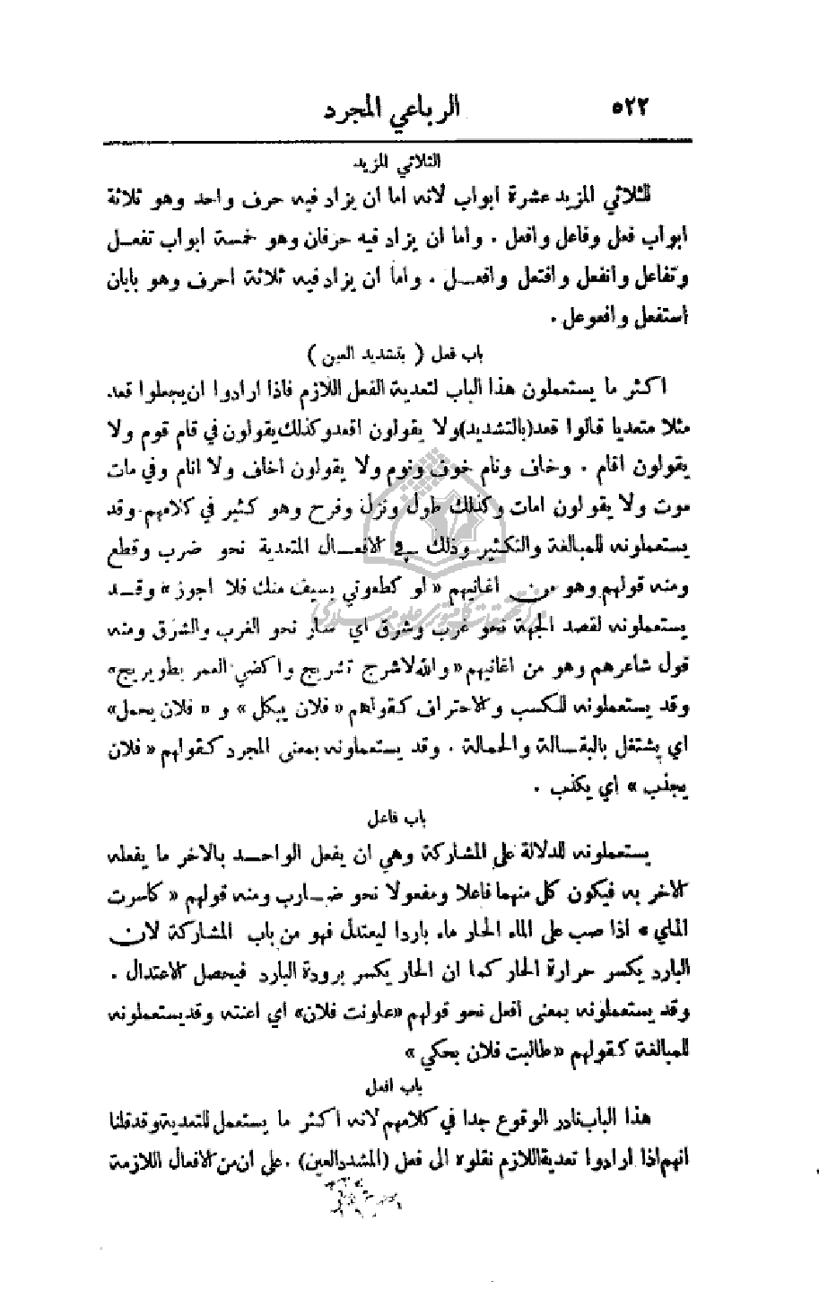 هذا الباب نادر الوقوع جدا في كلامهم لأنه أكثر ما يستعمل للتعدية وقد قلنا انهم إذا أرادوا تعدية اللازم نقلوه إلى فعل (المشدد العين). على أن من الأفعال اللازمة